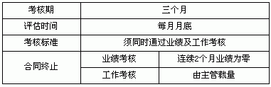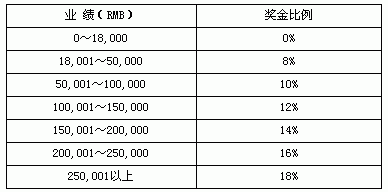 一、 佣酬:(核实业绩) 1. 固定薪资:1000元RMB/月 2. 交通补助:300元/月 3. 手机补助:200元/月 4. 业务奖金:当月业绩达成基本责任额时,可领取业务奖金500元RMB 5. 餐费补助金:每月补助餐费为220元RMB 6. 达成奖金:当月业绩额超过18,000元RMB时,开始领取达成奖金。奖金比例如下: 5. 持续奖金:每周举绩15,000RMB以上,连续3周,发放持续奖金1000元RMB 6. 杰出奖金:当月业绩超过10万元RMB,且为上海及北京两地业务人员业绩评比的第一名时,加发杰出奖金1000元RMB 7. 年终分红:当次年农历春节仍然在职者,可领取年终分红。年终分红的额度为个人全年业绩的百分之二 8. 业绩定义: a. 当成交价等于定价时,业绩以成交价的百分之百计算 b. 当成交价不等于定价时,业绩之计算方式由市场部主管会同总公司财务部精算后决定 c. 开拓经销商及代理商业务,不列入业绩计算,酬佣办法另订 d. 受理业绩:当财务部接到客户订金?quot;整笔订单业绩额" e. 核实业绩:当财务部接到客户尾款之"整笔订单业绩额" 9. 酬佣之计算均以核实业绩计算 二、 考核:(核实业绩) 1. 业绩考核:每月基本业绩考核额度为18,000元RMB 2. 工作考核: ⑴ 差勤考核:须按公司规定办理。 ⑵ 活动量考核:a.每周拜访量不低于13个(拜访量是指与客户面对面之销售约会的次数) b.每日电话拜访数不低于20个 ⑶ 行政工作考核:业务人员须按时且确实填写业务报表(含:活动管理表、客户资料表、电话记录表、潜在客户名单) 3. 合同的维持: 三、 晋升(核实业绩) 1. 晋升前六个月个人业绩总额达30万RMB以上,其中连续3个月每月核实业绩达到40,000RMB以上。 2. 无重大违规记录 3. 由直属主管推荐,经市场部主管批准,得晋升为客户经理 四、 法自2002年4月23日起实行,再修订 信息来源:中人网 |
