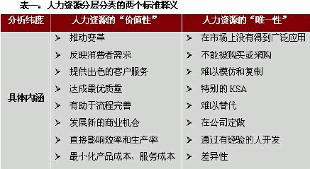 现代企业的竞争越来越集中于核心竞争力的较量。而构成企业核心竞争力的源泉在于核心人力资源。在未来市场竞争的较量中,企业如何将企业现有人才转变为提升企业核心竞争优势的源泉并予以开发?笔者认为,关键需要解决两个层面的问题:一是企业战略方向的引导并被员工认可;二是人才的合理使用并被“激活”。对此,构建一套战略性人力资源管理体系,是建设公司科学的经营管理体制的核心和基础。重构公司战略性人力资源管理的新体制,最重要的是把人看作企业中重要的战略性资源,按照企业战略要求,对企业现有人力资源进行分层分类的管理,并以此构建企业战略性人力资源管理体系。 战略性人力资源管理的出发点和归宿都在于打造企业未来的核心竞争力,核心在于如何从企业现有人力资源存量中培养、锻炼出一支具有核心竞争力的员工队伍。企业战略性人力资源管理解决方案的基础在于要对企业的人力资源进行分层分类的管理,核心是价值链管理,成败在于激励机制和沟通机制。如图所示: 从战略性人力资源管理的角度看,人力资源价值链的三个环节具有环环相扣的内在联系,可以说,激励的依据是价值评价,激励的手段是价值分配,而激励的目的在于使企业价值的创造者发挥主动性和创造力,从而为企业创造更多的利益。另一方面,价值评价和分配本身就是沟通机制的具体化形式。因此,只有在企业人力资源分层分类的基础上,建立起科学的价值评估体系和价值分配体系,才能形成有效的激励机制和沟通机制,从而推动企业各层级员工为企业创造更多的价值。 如何对企业人力资源进行分层分类 我们可以看到,一个企业核心能力就突出的表现为企业所具有核心的人力资源。核心人力资源是形成企业核心能力的基础,并已取代资金、技术、资本而成为商业企业重要的战略性资源,是构成公司核心竞争力的基本要素。作为知识和技能“承载者”的核心人力资源,代表了企业所拥有的专门知识、技能和能力的总和,是企业创造独占性的异质知识和垄断技术优势的基础。针对这一特殊的战略性资源必须进行分层分类的科学管理,以人为本,注重人和事的相互适应,注重对员工的培训和潜能的开发,建立有效的激励机制,才能充分发挥其创造性和主观能动性,从而谋求企业与员工个人的共同发展。 与企业核心竞争力的衡量标准类似,我们可以用“价值性” 和“唯一性”这两个标准来对人力资源分层分类,并以此界定企业的核心人力资源。首先有必要对我们所依据的这两个维度进行分析,然后利用“分层分类矩阵模型”将人力资源划分为四个象限加以界定。参见下图表 因此,我们可以把企业中的各类人员依据这两个标准划分入这四个象限,形成人力资源分类图。在企业的具体操作中,对两个维度的界定还需要进一步深入考虑: 1、衡量现阶段人力资源的价值,还是衡量远期的人力资源价值,或者采用贴现的方式将两者结合起来。 2、企业的各个部门对企业的价值贡献我们如何衡量,我们知道每个企业都有自己的独特性,因此在价值衡量上也各不相同,尤其是对于管理部门很难科学界定其价值。 3、部门内也将职务进行分类,加以评价,确定其性质,这一点可以采用职位评价的方式进行。 4、为了确定人力资源的唯一性,我们要进行劳动力市场供求调查,可以确定现有人才的唯一性,这很容易操作。但针对于潜在人才的唯一性我们要建立一套系统的评估方法。 5、四种人力资源并不是一呈不变的,他们之间的联系和相互转换需要建立一套评估的方法。 表二:分层分类人力资源管理模式详解