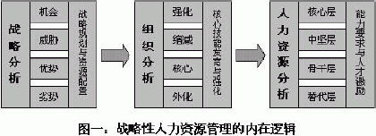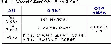 4、战略性人力资源管理的价值分配体系——以岗位工资为基础的薪酬管理 有效的薪酬制度是吸引、留住、激励高素质人才的必要条件。战略性人力资源管理中的“价值分配”的内容不仅包括工资、奖金、红利、股权,还包括职权、信息、机会、学习等,其中最重要的是企业薪酬体系的设计要体现分层分类的原则,其薪酬管理模式所遵循的基本思路: 1、必须贯穿“企业的战略目标——人力资源目标和战略——薪酬目标和战略”这条主线,强调提升企业竞争力。即要站在企业战略、组织和整个人力资源管理系统的高度来思考薪酬制度建立的目标、战略和基准,明确“要实现企业的战略目标,需要什么样的人力资源(关键成功要素分析),希望核心人才产生何种行为(关键成功行为界定);我们要吸引和保留哪部分核心人才;通过什么来手段来吸引和保留、激励这部分核心人才;其中薪酬在其中起到什么样的作用”。 2、必须围绕“价值创造——价值要素的分析——价值要素评价——价值分配”这一价值链条,即要明确是谁创造了公司的价值,哪些要素参与了价值的创造,如何来评价不同要素和不同的人在价值创造中的贡献,谁是价值创造的主体,从而确定价值分配制度应该向谁倾斜。价值链的引导过程中组织对员工的期望,即对员工行为的“要约”非常重要,应该通过合理的薪酬结构来体现。 5、战略性人力资源管理的培训开发体系——以在职培训为基础构建学习型组织 现代企业战略性人力资源管理必须树立人力资本投资观,要比投资物质资本更注重投资人力资本。构筑企业人力资源竞争力,就要高度重视人力资源的培训和开发,确立教育培训的战略性地位,建立“学习型企业”,将教育培训制度化,根据企业发展战略,制定可行的培训开发规划,建立全员教育和终生教育体系,促使员工不断更新观念,优化知识结构,提高综合素质。加强中高级管理人员的培养,努力造就一批既精通市场运作规则,又能准确把握国内外行业发展趋势,具有国际化水准的专业管理人才队伍。同时,配合公司从业资格认证制度的推行,通过分期轮训、网上教育和参加社会培训等多种渠道,开展大规模的员工培训活动,逐步建设高素质的员工队伍。