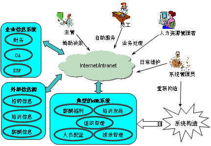 图1是一个eHR系统的典型运行状况图,这个图显示了一个正在运行的eHR系统所必须具备的功能。从这个图我们可以看出eHR系统面临的技术问题: 1.企业全员参与的实现,也就是所谓的员工自助服务或者员工门户的实现。 2.系统的安全性。 3.从大量的基础信息中,获知企业的人力资源现状和对未来发展的预测分析。 4.与内部信息系统和外部数据源的接口 5.系统的灵活配置和定义,这是目前复杂的人力资源管理状况所必须的。 6.其他。除了以上必须解决的技术问题外,还有诸如多语种的支持、系统维护和管理和可移植性等问题需要解决。 只有解决了以上的技术问题,一个e-HR系统才能真正为企业的人力资源发展提供所必须的支持。 |
