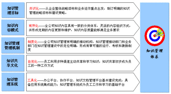 那通过整体的知识管理解决方案,企业在知识管理方面应该达到什么样的目标,实现怎么样的“管理”和“IT”结合呢?可以归结知识管理体系的五化(图4):知识管理目标的共识化、知识内容模式的有序化、知识管理管理机制的制度化、知识共享文化的自觉化、知识管理系统的工具化。