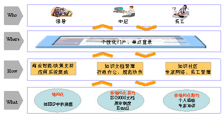 那么,KMSS到底有何功能呢?可以用一张图来表示,其核心在于通过一个集成的系统实现人(Who)、访问入口(Where)、功能(How)、知识(What)的统一(图1): Who:领导、中层、员工、外部人员; Where:个性化知识门户,并以单点登录方式; How:调用相关功能,如知识文档管理、规范协作管理、行政办公管理、知识社区、应用系统集成、商业智能等; What:获取、挖掘和利用所需的三类主要信息和知识,即业务应用系统如ERP里的结构化数据、文档类的非结构化显性知识和经验类的非结构化隐性知识。只有这样,才能在实现对业务支撑系统提升的同时,奠定了企业真正“管理”信息化的基础。 知识管理:管理的视角