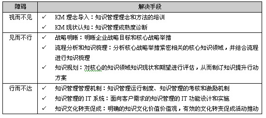 这还首先需要从分析企业推动知识管理时存在的主要障碍入手。在长期的知识管理咨询和系统实施的实践经验中,我们发现有三大障碍是企业推动知识管理时是必须要跨越的,即:视而不见、见而不行、行而不达。 视而不见:这主要是“不知道”的问题,目前国内还有很多企业不知道什么是知识管理、不知道知识管理包含哪些内容、不知道为什么要知识管理、不知道自己的知识管理做得如何、不知道自己的知识管理存在哪些关键问题。 见而不行:这主要是“不能够”的问题,目前也有很多国内企业对知识管理这个事情已经形成了共识,但如何做还不是很清楚,比如:不能够明晰影响知识管理的企业整体战略目标和关键战略举措、不能够识别企业的核心知识领域、不能够系统梳理出相关知识领域中的知识资产、不能够合理设计针对关键知识领域的知识提升行动等等。