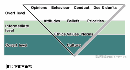 文化三角形按照透明度的不同将公司文化分为三个层次,每一层都包含若干个文化要素,最下面的是里层,包括一些无形的要素;中间层大部分都是无形的,但是有时候能够被人们识别;顶端的表层也称显示层,人们能够识别、感知这一层里所有的文化要素。在这个模型里,外层的要素都是以内层为基础的,换句话说都来源于内层要素的衍生,是内层要素的表现。 在文化三角形里,价值观作为企业里层文化和表层文化的中间联结,令其地位显得举足轻重。一旦公司的价值观确定,它将会被公开,并大范围的传播,并最终影响企业和员工的行为,这种转化一般通过大量的对具体行为的理解和分析达成。 对公司价值观的分析对于组织非常重要,因为人力要素出现的问题不一定是个人违反、违背制度造成的,而可能是由于文化三角矩阵里要素的模糊界定所导致。公司可以在文化三角形里找出出问题的地方,然后直接将校正的目标定在问题所在相关层,进行矫正,这样的纠正效果比起仅仅对问题人做出反应会更有效和准确。例如,工作马虎、自傲一般情况下被指责为个人的不良习惯,但它们很可能是文化三角形里某些要素的不规则所导致的。下面我们会进一步阐述。 “X文化”和“Y文化” 如果你试图影响一个人的行为,那么我们建议你将努力集中在文化三角形的里层和中间层上,因为层次越深,它对人的行为的影响就越大。例如一个清楚表达“安全”的文化就对人员的安全观念有很积极的作用。 如果管理者直接将焦点全部放在行为层面而忽略内部层将可能会导致越来越多的指令、法规、政策、命令、指南等其他类似的控制行为的辅助措施。这种战略往往导致与充分信任员工的“Y文化”观念的冲突,因为新发现的行为的不规范将会导致新的制度的出台。长此以往,惩罚和监督的措施越来越多,对于公司来说一个制裁的体制很容易就会被建立起来,慢慢的,这个公司的文化就可能转变为对员工不信任,以监督和惩罚为主的“X文化”。一旦“X文化”在公司内部扎根,那么许多缺点将暴露、危险也会应运而生,这种文化不但能够消磨员工的责任感,甚至会令人产生恐惧心理,这将会导致人们不敢倡议直言,不能够坦诚以对,团队精神和主人翁精神也将不复存在,整个公司的积极的管理风格会受到严重的影响。