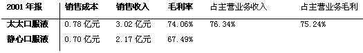 二、成功背后的阴影逐渐显露 的确,能把精致的广告和牢固的终端两者兼而有之的医药保健企业并不多,太太是其中翘楚,不象海王广告有声有色而终端疲软无力,也不象红桃K终端天衣无缝而广告土气十足,太太确实有点“罗伯特 卡洛斯”那种全能选手的意思。然而,战术运用得再精良,如果没有卓越的战略指导的话,迟早危机的阴影将逐渐显露。 1、从公司战略上看太太的经营范围广但没有形成良好的结构 尽管经过11年的发展,太太已从单一的中药保健品企业转型为集中成药、保健品及化学品原料和制剂的开发、生产和销售于一体的现代化综合性制药集团。然而在如此广泛的布局里,口服液产品却依旧是太太唯一的“金牛”(市场份额大增长率低),其它产品对总体的贡献相当微弱。 从口服液产品的内部地位看,2002年报表明太太口服液占主营收入的比例有34.05%,静心口服液则占24.46%,两项加总为58.51%,尽管与2001年相比已经有所降低(见下表),但依旧稳坐“头把交椅”;另外从口服液产品的市场地位看,多年来“太太口服液”、“静心口服液”分别占据了国内美容保健品和更年期保健品市场的半壁江山,其地位更是莫可它比。