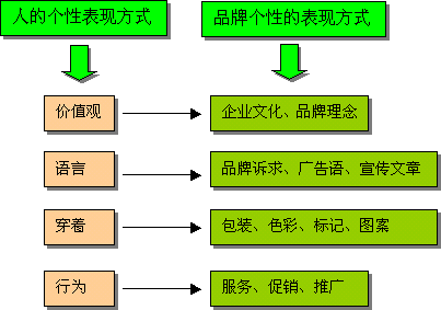 但是在进行产品概念的推广时,也不能忽略对品牌的塑造,要保持品牌概念与产品概念的相关性,否则当企业花费巨资让消费者认知并认同了这个产品,由于没有对品牌进行塑造,所以当企业推出新品时,无法借助品牌的张力,导致必须重新教育市场。比如:如果企业的产品是工业用仪器仪表,那么产品概念主要应该在产品的功能和特点上,而这时也必须进行品牌的塑造,品牌的个性必须与产品特点相一致,活泼动感显然就不合适了,适合工业品的品牌个性应该是诚实稳重的。 4.注意凸现品牌个性的差异性。 品牌的个性是指品牌的独特气质与特点,因此必须具有差异性,否则品牌个性与竞品雷同,就会丧失个性,无法形成品牌的张力。 品牌个性的差异性是建立在品牌定位的基础上的,必须符合产品的特点和消费者状况,并表现在品牌的各个要素上,如产品包装、品牌标识、广告诉求、价格差异、促销策略等等。 P&G公司的品牌管理非常成功,整个公司的品牌定位很简单,就是“宝洁公司,优质产品”,在这个品牌定位基础上,以洗发水为例,不同的品牌就有不同的特点和个性,“飘柔”是“自信”,“海飞丝”是“清新潇洒”,潘婷是“靓丽”,沙宣是“时尚”等等,在广告代言人、广告诉求、产品包装上都与自己的个性保持一致,从而使一个品牌在消费者心中留下深刻印象。 5.品牌个性的表现方式。 品牌的个性表现与人的个性表现是有许多相似之处的: 首先,深层次的是一个企业的企业文化、价值观,这在表面看起来跟品牌个性没太大关系,其实是一种误解。一个品牌,包括他的产品本身、核心价值、服务都是企业管理理念的折射,一个保守的企业不可能创造出一个动感时尚的品牌。这就跟人一样,一个人的价值观、道德观将直接影响他的态度、行为、语言等要素,自私的人缺乏对社会的责任感和使命感,不可能成为见义勇为者,同样,惟利是图的企业不可能塑造出一个具有高度美誉度和忠诚度的品牌。 其次,品牌诉求、广告语、宣传文章是公司通过各种媒体对外宣传自己品牌的“语言”,因此,语言的风格就非常的重要,就跟我们说话时,有的人含蓄,有的人直爽,还有的人幽默或者深沉,每一种方式都是其个性的体现。 然后,产品的包装、色彩的选择、企业标识、卡通形象、广告形象代言人都反映出一个品牌的个性。比如力士洗发水的品牌定位是高档与高雅,具有高贵的气质,因此它的广告代言人都是国际明星,比如象张曼玉、章子怡,这些明星的气质和形象与它的品牌定位非常的一致。 最后,一个企业的行为也能反映出他的独特个性。企业的促销策略、服务方式、推广方式、渠道策略、内部管理都能反映出一个品牌的个性,因此,品牌个性的塑造是全方位的,而不是仅限于产品和销售本身。 下面的这个图形把品牌的个性表现方式与人的个性表现方式进行了对照,可以很清晰地看出两者之间的关系。