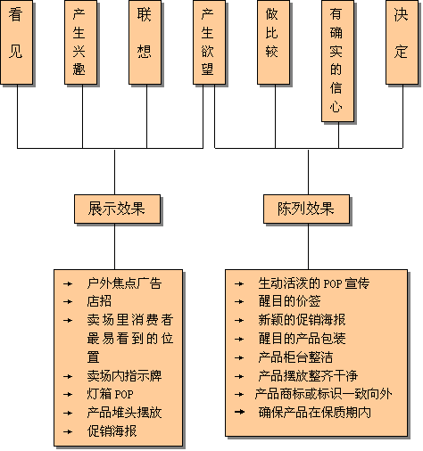 2. 市场生动化对顾客消费心理的影响 市场生动化主要包括展示和陈列两个方面,其中包括很多具体的工具和方法,展示和陈列在消费者购买心理中的作用是不同的。