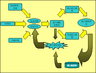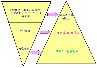 首先依据企业的使命、远景、价值观和外部环境确定企业的发展战略和企业文化。依据企业战略规划确定的企业核心竞争能力;依据企业文化的价值观导向确定企业倡导的文化氛围。并在此基础上研发企业员工的核心能力与素质要求,并以此为基础形成企业员工的胜任能力模型。 由企业战略得出企业应该具备的核心竞争能力是什么,再由核心竞争力推导出与之相应的核心人力资源的特点是什么,企业员工应该具备的核心技能与导出与之相应的核心人力资本的特点是什么,企业员工应该具备的核心技能与专长是什么,随后根据此特点和要求对企业人力资源进行分层分类,明确各类人员应具备的知识.技能与经验是什么,最后,再针对不同类型的人力资源采取不同的开发与管理模式.假设上述过程可逆,则人力资源管理对企业战略目标的实现起到了强有力的支撑作用. 根据四元价值观的核心理论,对企业核心价值观进行有效的层级分解,使企业核心价值观转化为员工的具体的能力素质与行为要求,形成基于企业文化的全员核心胜任能力模型,期望以此达致企业文化由虚入实、落地生根的效果。同时,核心价值观的素质要项的分解,直接形成了核心价值观制度以及其相关的素质行为的描述,为企业文化实施中《基于核心价值观的员工行为规范》提供标准。 三、基于公司战略与核心竞争优势的胜任能力模型 基于公司战略与核心竞争优势的胜任能力发展模型由三个部分构成:全员核心胜任能力、序列通用胜任能力和序列专业胜任能力。
