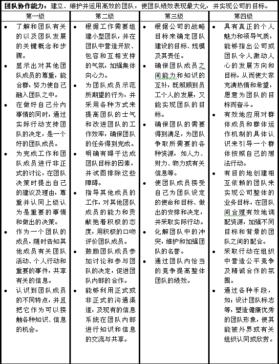 全员核心胜任能力:是公司价值观、文化及业务需求的反映,是针对组织中所有员工的、基础且重要的要求,它适用于组织中所有的员工,无论其所在何种部门或是承担何种岗位是针对组织中所有员工的。 序列通用胜任能力:是依据员工所在的岗位群,或是部门类别不同而需要的专业知识、技巧及能力。在多个角色中都需要的技巧和能力,但重要程度和精通程度有所不同 序列专业胜任能力:在某个特定角色或工作中所需的特殊的、独特的技能。 四、如何构建基于公司战略与核心竞争优势的胜任能力模型 首先,明确公司的战略目标、价值观及核心竞争因素;从公司的价值观、使命及核心竞争因素归纳员工的核心能力素质。 其次,从公司的业务及各岗位群的职责出发,设计各岗位群所需的序列通用胜任能力;从各个岗位的职责和业绩优劣者的表现出发,设计各岗位层级的序列专业能力。 第三,分析全员核心胜任能力、序列通用胜任能力和序列专业胜任能力,设计每个能力的主要行为表现指标。 第四,根据专家数据库和BEI中的记录,分析设计胜任能力的各级行为表现; 第五,验证并应用胜任能力模型。 胜任能力模型示例: 团队协作能力:建立、维护并运用高效的团队,使团队绩效表现最大化,并实现公司的目标。 第一级 第二级 第三级 第四级