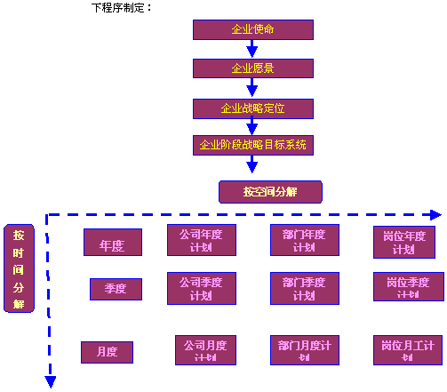 二、路径系统 路径系统就是战略实施的具体过程,这就涉及到具体的工作计划,一般路径系统的设计需要开展以下的工作: 1)确定与战略相匹配的组织结构和组织职能定位; 2)设定新的战略体系下的业务流程结构和业务模式; 3)将公司的发展战略转化成公司的战略实施计划、年度工作计划或者季度工作计划,并将工作任务分解到相应的部门和人员; 4)按照企业价值体系图将公司的战略目标分解成可以月度或者季度考核的绩效指标和绩效标准; 在进行工作计划安排时,一般要分清楚战略性工作计划和常规性工作的计划,以尽量避免因忙于日常事务、战略性工作的不可琢磨性或者困难性而忽略战略性工作的开展。 之所以企业的战略路径系统不同于企业日常的工作计划,是因为企业路径系统的产生是依循于企业的战略体系的,而不是按照原有的习惯做法或者传统的预算方法来制定的,依循于企业战略路径系统的工作计划一般按以下程序制定:
