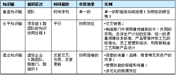 图1 知识链分类表 垂直知识链,是指直接面向某一具体职能或流程的知识过程。当企业开发、改进它的垂直知识链时,学习曲线反映了单位成本的降低,提高了生产绩效。垂直知识链是单一方向的知识链,它的增值方向是单一的,它的收益是知识单元收益的简单相加。这种知识链是最常见的,产品研发能力、制造能力、营销能力等均属于垂直知识链的范畴。 水平知识链,是指提供垂直知识链之间必要的联系以确保知识链的连续、产品功能完备性的知识过程。土要表现为跨团队的协作获得了知识链之间的协同效果。不同的流程、生产环节知识链的协同,成为水平知识链创造价值的方式。如本田公司将小型四冲程汽油发动机的制造技术应用于汽车、割草机和艇外推进机等产品的生产过程中。 混合知识链,是指协调不同项目组之间的水平和垂直价值链的知识过程。表现为对外部环境的适应,将科学的学习机制镶嵌在组织结构中,不仅表现为对组织内部资源灵活应用的快速适应,而且表现为对外部资源的获取来适应环境,在知识链的形式上表现为知识链的整合、反复交融与更新的过程,其创造价值的方式往往是倍增的和周而复始、无限循环的。水平知识链和混合知识链都可以称为复合知识链。 虚拟企业的竞争优势来源于其庞大、复杂的知识链系统。虚拟企业既可以通过创建新的知识链、改进企业内部流程优化其单一知识链获得竞争优势,也可以通过整合伙伴企业间复合知识链获得竞争优势。如新产品的发明,就是成功创建了一条新的知识链。在不同的零部件生产中,共同的采购、总体生产计划的安排、统一的质量保障体系标准、产品零部件和工艺的标准化、员工管理和培训、利用新制造 艺和新产品设计,这些横向的辅助技术和信息的共享,就是利用水平知识链的知识协同效应。又如合作伙伴企业形象在新合作组织中的借用和共享,管理技能在相似业务单元的移植和传播,这些都是存在于虚拟企业中较为典型的混合知识链。 |