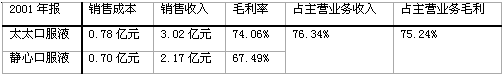 从1994年到2004年,在中国经济转型最艰难的十年里,太太磕磕绊绊的走过了十年,正是这十年,铸就了太太在中国企业界,特别是保健品业界“活化石般”的不倒神话。 过去的成功会成为再度前行的负累吗? 莎士比亚说:“会的,当成功没有被放下时,成功也就成为了前行的负累。” 然而,城府良深的朱保国却不屑,尽管在一次接受《北京娱乐信报》记者采访中,朱保国不无深意的感慨,“未来怎样,我主意未定”,但面对敏感的媒体记者趁势深究时,朱保国也觉察到了自己言语失态,便立时话锋一转,撒手放出了个烟雾,“太太药业主营方向一直很明确,并且也一直很成功,现在太太正全力拓展新的利润空间,并已经在OTC和西药抗生素药品等方面初有斩获”,于是,可怜的记者就这样被朱保国轻松的蒙了过去。 其实,现在的太太,正面临着全方位的战略迷失危机。危机中挣扎着的朱保国,真的是好惶惑。 保健品业,历来是“风流总被雨打风吹去”,然而不可抹杀的是,朱保国其人和其控制的太太药业(健康元的简称)是保健品行业当之无愧的另类,他和他的太太药业在命运多舛的保健品业整整“风流”了12载,这不能不说是人皆可叹的奇迹。当飞龙远去、太阳暗淡、三株作古、巨人倒下之后,保健品业历经风雨洗刷而日久犹新的“墓志铭”上,应有朱保国。 过去的朱保国,真的是很成功,但今天,他开始惶惑了。 尽管经过12年的发展,太太已从单一的中药保健品企业转型为集中成药、保健品及化学品原料和制剂的开发、生产和销售于一体的现代化综合性制药集团,但在如此广泛的布局里,口服液产品却依旧是太太唯一的“金牛”(市场份额大增长率低),其它产品对总体的贡献相当薄弱。 从口服液产品的内部地位看,2002年报表明太太口服液占主营收入的比例有34.05%,静心口服液则占24.46%,两项加总为58.51%,尽管与2001年相比已经有所降低(见下表),但依旧稳坐“头把交椅”;另外从口服液产品的市场地位看,多年来“太太口服液”、“静心口服液”分别占据了国内美容保健品和更年期保健品市场的半壁江山,其地位更是莫可它比。