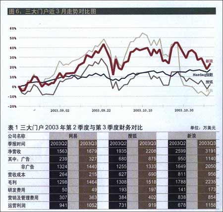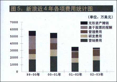图5:新浪近四年各项费用统计图。 从图5中可以发现新浪的运营开支的控制重点。对企业常规的三项运营开支(营销费用、研发费用、管理费用),新浪实行了刚性的控制。其中,营销费用和研发费用与3年前相比分别下降了8%以及24%,管理费用上升了39%,其中应当包括营销部门迁址到CBD后增加的费用。 由于采用了更加审慎的扩张战略,新浪不会再盲目地去并购了,而是选择优势互补、价位不被高估的企业。这样,反映在无形资产摊销这项费用上,前3年该项费用基本保持稳定,而由于已经基本摊销完毕,第4年的该项费用大幅度下降。 在各项费用中,下降金额和幅度最大的就是“基于股票的报酬”这一项了,对于新浪来说,主要是由于股票期权产生的费用。像许多网络公司一样,新浪在上市前和上市初期也发放了大量的股票期权。1999-2000年度,新浪的股票期权计划使得1907万美元计入费用,而当年的毛利只有区区265万美元。在随后的3年中,新浪对股票期权进行了大幅度的削减,2002-2003年度的该项费用仅仅相当于3年前的6%。通过对股票期权的削减,新浪每年要减少1000万美元以上的运营开支。当然,这也对员工的激励产生了一定的负面影响。 与今年前8月股价的节节攀升相比,三大门户在近3个月的表现可谓差强人意。与3个月前的股价相比,新浪表现略好,也只是上涨了20%左右;搜狐次之,涨幅不到10%;网易则下跌了不到10%。与纳斯达克指数相比,只有新浪勉强跑赢大势,而另两家的股票走势都远远赶不上大盘。