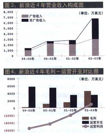 图1:新浪上市以来股价走势图;图2:新浪近四年营收及净利润图。 我们以每年的7月1日至下一年的6月30日作为一个年度周期,看看新浪是如何完成从亏损5098万美元(1999-2000年度)到赢利1141万美元(2002~2003年度)的转变的。(新浪现在的年报已经改为以公历年为周期、为便于与以前的年报比较,2002-2003年度的数据是根据两个半年的数据相加得出的)。 变化首先是营业收入的飞速增长。1999~2000年度,新浪的净营收仅有1417万美元,3年后其净营收已经增长到6732万美元,年复合增长率高达68%。从图3可以看出,近4年来新浪的广告收入保持相对校为平稳的增长势头,而非广告业务(主要是短信业务)从20O1-2002年度开始突飞猛进,尤其是收购讯龙后的20O2-2003年度,非广告收入比上年度增长了近4倍。