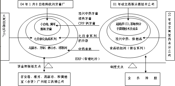1 构筑第一个"同心圆"体系 美晨在实行多元化以前一直做牙膏,其旗下的黑妹牙膏也是畅销品牌。1997年美晨收购广州梦思股份有限公司和广州人民日用化工厂,正式涉足化妆行业,在牙膏这个核心圆上加上一个次核心圆,后来;又逐渐推出花露水、牙刷、淑口水、清新剂等日化产品,再加上一个外圆。至此,以牙膏为核心的第一个同心圆体系初步成型。美晨的化妆品、牙刷等产品都可以利用著名牙膏品牌"黑妹"的影响力和已经搭建的遍布全国的营销网络快速推向市场,美晨经过这么多年的努力也确实培养出了七日香这个广州化妆名牌。这些产品的推出充分利用了原来的营销力量,将运营成本降低,产生了很好的协同效应。 2004年1月8日美晨对杭州牙膏厂的收购则进一步巩固了其核心业务--牙膏的竞争优势。这一并购起码让美晨获取了以下三点好处:一是规模收益。牙膏市场的竞争越来越拼实力和规模了。就在2003年11月,高露洁还斥资一个多亿收购扬州三笑集团的牙膏、牙刷生产设备和商标权益,大举进入牙膏的低端市场。杭州牙膏厂的加入让美晨不仅能生产主导的黑妹牙膏,还能产儿童牙膏和医疗牙膏,产能迅速提升,更好的分摊了美晨在全国投放的巨额广告及营销费用,降低成本,规模效益初显。二是品牌收益。杭州牙膏厂旗下的两个商标"小白兔"和"黄苓"虽然被摘了浙江省著名商标的牌子,但其影响力还在,只要美晨加以"包装"和提升,其知名度会很快恢复,这样美晨一下子拥有三个有名的牙膏品牌,各占据一个细分市场--"小白兔"是儿童牙膏,"黄苓"是医疗牙膏,大大改善了只有"黑妹"这个主要定位在年轻人的品牌"孤军奋战"的状况。三是网络收益。杭州牙膏厂作为华东地区两大牙膏厂之一,在华东地区自然有比较完善的经销商队伍和营销网络,美晨通过入主"杭牙"正好可以实现打入老竞争对手上海牙膏厂的"腹地"的愿望,大大加强了自己在华东地区的竞争地位。当然,小白兔和黄苓也可以通过"黑妹"的网络迅速走出华东地区成长为全国性的品牌。