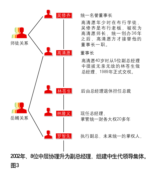 “统一也有决策失误的时候,比如统一速达就亏损了七年之久。但只要我有信心和眼光认准这个商业机会,我就会坚持下去。” ——统一企业集团董事长 高清愿 统一有近十位副总经理 ——外延分散权力,严密矩阵结构 吴克诚是天津统一食品有限公司的总经理。最近,他正在让各部门主管做工作总结。此前统一大陆总部总经理办公室的李时德通知他,集团海外事业部总经理将于6月初来大陆公务出差并检查工作。