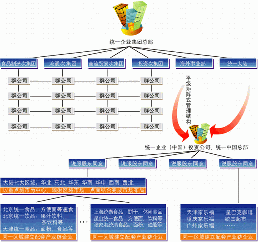 通过将总部的管理权限下延分散至次集团,统一建成了一个层次分明却不陷于推诿泥潭的组织结构。按照集团旗下公司的不同事业特性,统一成立了四个不同核心的次集团,分别是食品制造次集团、流通次集团、商流贸易次集团和投资次集团。 次集团的存在目的,并不在于单纯的组织架构的重整,而是由于统一的企业特性所决定。比如统一的食品产业,就拥有食粮、速食、饮料、冷藏、低温食品、保健食品等不同事业群。产品更是拥有饲料、面粉、油脂、方便面、面包、非酒精饮料、乳制品、冰食品、冷冻调理食品、肉制品、酱味调料等数十种,而每一种产品则有可能在多地区设立分厂,其食品次集团本身已经有设立专门的集团总部实施管理的需要。 通过设立次集团形式的分散形组织结构,统一将大部分的集团内日常管理事务下放至各个专业次集团,仅保留如战略决策、经营方向、业务转型等重大性权限在统一总部。统一除了一名总经理之外,还有五到十位副总经理,总部可以将众多次集团的管理事务明确分配给各个副总经理,明确分工且各负其责。 在各个相对庞大的次集团组织之下,统一按照经营行业的不同将公司划分为群公司来管理。如统一主营业务的食品制造次集团下面就又划分为食粮群公司、速食群公司、饮料群公司、低温群公司、冷藏群公司、保健事业群公司、流通群公司等等。 这些群公司在统一内部被称作为“虚拟群公司”,在按不同行业划分之后,实行统一企业全球化布局中的垂直集成管理模式,并与统一的次集团组织结构相结合,组成严密的矩阵形管理体制。 而在中国大陆,统一也成功拷贝了这一组织机构模式。1998年成立的统一企业(中国)投资公司,即全面负责统一在大陆的投资布局,同时也是统一中国的管理总部。在接受统一企业集团海外事业部的管理时,统一(中国)总部也受统一总部的直接领导。颜博明是统一(中国)总部的副董事长,也是统一企业(中国)投资公司的副董事长,由于董事长一职是统一总裁林苍生挂职,所以颜博明便能直接管理中国大陆市场,并与台湾总部总裁林苍生直接沟通,减少了由于管理层次过多造成的效率低下及官僚主义问题。 能卖方便面,就能卖茶饮料 ——同一商业链内扩张,带来极大管理便利性 在北京,统一拥有两家企业:北京统一和北京饮品。二者虽然都属于统一集团的食品次集团,业务却并不冲突。 北京统一主要生产方便面等速食产品,而北京饮品则主要做饮料,这两家企业互为补充,形成配套的商业链。上海统泰与上海统一也是这样的关系。这种由点到面的区域性经营网络,正是统一的布局策略。 1992年1月13日,统一企业集团在中国大陆投资设立的第一个企业——新疆统一企业食品有限公司正式成立。虽然统一正式进入中国大陆市场时,选择了新疆作为自己落地的第一站,而不是北京、上海等大城市。但到现在,短短十年时间,统一企业集团已经在中国大陆投资了50多家企业,并且完成了全面的网络布局,成功占领了中国食品市场。