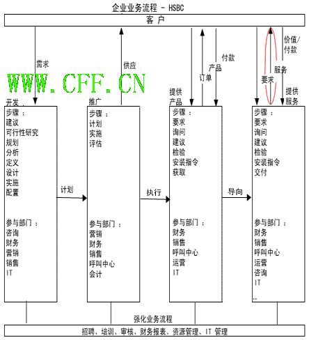 红体字是在这个案例中的接触点。 价值观 · Box (产品特性): 一系列实用的、利润丰厚的且有价值的产品。它们并不便宜,但是值得并可靠的。 · Box + (服务特性):通过多种渠道提供一系列实用的、有帮助,而且价值高服务。 · Box ++ (客户关系):双赢局面。 总的来说,汇丰银行通过为其顾客提供五种渠道的服务来使他们感觉便捷和服务的灵活多样性(网上银行、电话银行、自助银行、移动银行和分行)。 但是,客户有比实际体验更高的期望值。这其中也是有原因的。近几年,银行分行的数量比以前减少了。这使得现有的银行接待的客户数量增多。就电话银行而言,客户要按照提示办理的手续太烦琐,这使得他们感觉不便.。此外,自助式银行所提供的业务范围不是很广,而移动银行目前在香港还不十分成熟。尽管网络银行做到了随时随地提供服务,仍有一些客户不愿使用银行网站。 汇丰银行已经为重要的客户提供便捷的服务。他们享受着由专业的客户关系经理所提供的个性化服务。只需一个电话,他们就能得到任何金融服务和帮助。但是,他们有时并不乐于接受这种一站式服务。如今,客户对银行服务更加挑剔,特别是当他们知道银行把他们归为重要的客户时,更是如此。他们需要立即得到想要的信息和服务。他们不愿意等到另一个电话才得到答复,或者需要另外安排时间与金融专家见面才解决问题。 在访问 www.hsbc.com.hk时,你可以发现汇丰银行为个人和公司商务顾客提供许多银行产品和服务,例如投资、抵押、融资计划、保险、银行卡、贷款等等。每一组产品都有自己的帮助热线和专家提供服务,但是顾客通常要拨打不同的热线来取得不同产品的讯息。 以上几点让我们感觉到了服务与体验的差距。我们可以通过对客户关系经理进行更多的培训,使他们具备更专业的金融知识来改善。但要使经理通晓银行所提供的所有产品和服务是很困难的。所以还是把重点放在程序调整和硬件配置方面为好。我建议在主要服务中心建立实时视频会议系统。无论何时客户需要更专业的建议或信息,都可以通过该系统来提供一个面对面的交流。另一方面,当客户来电需要帮助时,经理可以将电话转给专家,来进行远程交流。那么,客户将真正使用这种随时随地的一站式服务。为了确保这类服务的顺利进行,首先要保证有足够的专家资源和信息。 汇丰的在线银行提供一系列的便捷,但还没有做到一站式的服务。在线银行业务应该整合即时沟通。无论何事,在线银行客户有任何问题,他们都能通过向客户服务中心发送即时讯息,并得到立即的答复。这种服务尤其受到那些乐于DIY自己帐户的客户的欢迎。而这也会成为汇丰的电子银行一个强有力的竞争优势。 最后,汇丰 IT人员应该整合各种不同的系统,形成的客户端界面可以使授权的客户服务人员即时得到所有产品的信息和客户数据。 业务流程管理——企业业务流程 为了让流程管理者更好的安排各个部分,我们将人力和信息资源重组,设计的企业业务流程如下: