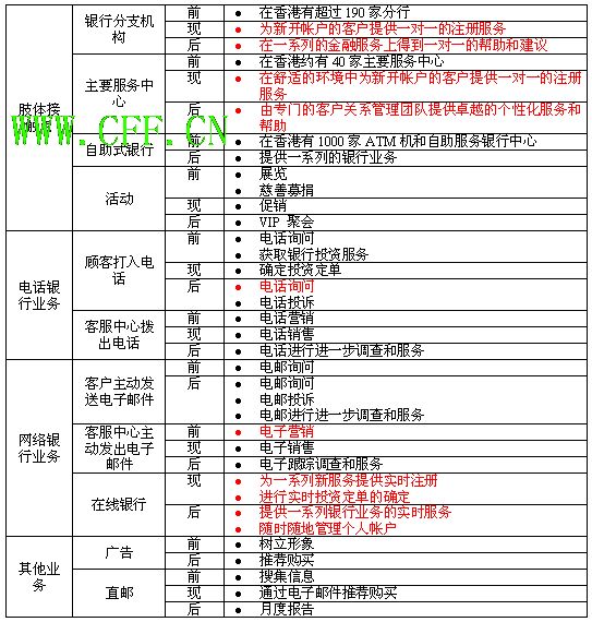 在这个案例中,我们是通过杰出的服务来达到我们的战略目标的。此流程涉及咨询、融资、销售、热线中心、运营部和IT部。 CRM 度量标准 我们必须运用多种度量标准评估执行的效率: /> · 利润/收入 · 交叉销售率 · 客户反馈 · 现场客户调查 · 在线客户调查 · 客户满意度 · 客户保持率 · 推荐率 · 每次视频会议服务完成的工作量 · 每次电话会议服务所完成的工作量 · 每次即时短信所完成的工作量 结论 “为每一个客户度身定制不同的方案”是当今世界银行服务的大趋势,同时也是银行在市场中获得竞争优势的有力法宝。而CRM的客户理念早已融入银行领域。作为世界最大的银行和金融服务组织之一,汇丰银行在客户关系管理方面已经做的很好了。由于其在过去所取得的良好声誉和拥有卓越的服务,使得客户对它的期望值比其他银行更高。这就使汇丰必须在这方面投入更多的精力和资源。由于客户满意度等于客户期望值减去客户体验值,所以无论期望值有多高,只要还在一个合理的水平,汇丰银行就必须不断以上乘的服务来满足他们的上帝——客户。 |