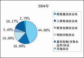 如图所示,制度建设是我国上市公司董事会会议决议的“重头戏”。我国市场经济趋向的改革已经走过了十几年,但作为我国最优秀的企业群体,上市公司却仍旧停留在制度建设的层面上。在证券市场发达的国家,对公司管理层的监督主要是依靠相对完善的股票市场和公司控制权市场来完成,董事会的职能更多地偏向于战略决策。而我国的董事会承担了过多的监督职能。同时,由于很多上市公司的董事会主要由执行董事构成,使董事会更多地关注公司的经营问题而不是战略问题。有关公司的战略决策、发展计划的会议实在太少了,导致董事会在某些关键的公司长远问题上很少发挥作用,董事会的职能未能得到淋漓尽致的发挥。过多的无效率会议,不仅消耗掉了董事会的大部分时间,甚至会给董事会治理带来适得其反的结果,最终会导致董事会的战略决策能力的弱化。 六、专门委员会制度没有真正到位 公司董事会下设的专门委员会,在上市公司董事会治理中发挥着关键作用。委员会的建立与人员构成也是董事会独立性的重要指标。从总体上看,有近半数的上市公司董事会没有下设专门委员会。即使设置专门委员会的上市公司董事会,在运作方面也很不完善,尚未发挥其应有的功效。另外,由于独立董事制度存在的种种缺陷,专门委员会的委员人数较少,并且独立董事在其中并没有发挥主导作用,因此也就难以保证主要专门委员会的独立性。完善上市公司董事会的专门委员会制度,是目前各个上市公司不容忽视的问题。 七、董事的考核和评价体系没有建立 目前,我国上市公司的董事会普遍缺乏独立、客观的董事业绩考核与评价体系。公司董事会的核心功能是战略决策,而决策的可行性和有效性关系到公司的长期绩效和发展。而我国绝大多数的上市公司,在年报中仅仅简单披露了对高级管理人员的业绩考评制度,但缺乏独立、客观的对董事会和董事的业绩评估。甚至连出席董事会会议这种最基本的问题,都没能得到有效制约,就更不用说许多董事的责任感不强,对公司的经营理念、战略计划和业务规划不够了解这些更加具体且重要的问题了。由于我国的相关法律法规尚不健全,所以董事会必须根据自身状况对每一个董事的绩效进行定期、独立、客观的评估,为此应该建立科学的考核与评价体系。 八、董事的激励机制有待完善 在绝大多数发达市场经济国家,上市公司通过建立由外部董事和独立董事组成的薪酬委员会,来评价公司的首席执行官、其他执行董事以及高级管理人员的绩效,并核定他们的激励薪酬。经由董事会推荐并在公司的股东大会上获得股东批准,同样的程序也适合于对非执行董事的激励薪酬。我们通过分析发现,我国上市公司的董事利益与公司利益缺乏直接的关联,董事激励机制不健全,因此难以保证董事在决策过程中能够充分考虑公司的长远利益。股票期权等在国外行之有效的激励方式,在我国运用得比较少。完善的公司治理机制必须建立在市场化的、动态的、长期的激励机制基础之上。总的来说,当前对公司董事的激励机制不能对公司董事起到应有的作用。