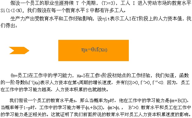 可见,员工的工作分配遵循一个简单的原则,只有当预期的岗位人力资本超出关键值h¢,的时候,员工才能够被分配到高层的工作。而且只有预期的岗位人力资本对工作分配产生影响,公式内的其他部分不对工作的分配产生任何影响,这是因为在任何工作中生产力是岗位人力资本的线性函数,而学习认知的速度与工作任务的分配是无关的。 那么,根据员工学习能力的不同而导致的员工人力资本提升速度的不同,企业就可以对未来员工薪酬水平进行更改,工人在工作中的学习能力与其未来工资的增长有密切关系。此外,我们可以看出,员工入职伊始的工资是教育水平的递增函数,教育水平越高,工资就越高;而且由于函数的递增特性,教育水平越高的员工其学习能力提高的也快,人力资本积累的就快,那么他受到提升的几率相对就会很大。这些都完全符合我们平时的理解与操作。 我在国外认识的朋友小张今年刚从英国留学回国,CITY的管理学硕士,他被上海一家很出名的美国公司招收,因为是刚刚工作,工作经验很少,所以他被指派为一个部门的经理助理,但是他的工资却比这家美国公司另一个同级部门的经理还要高,是不是很令人疑惑?通过人力资本的观点我们可以较好的解释这个问题。 预期人力资本是由员工的学习能力和工作经验决定的,小张由于工作经验有着明显的弱势所以其预期人力资本相对较低,与是被分配为经理助理;但是因为员工的工资不仅由于其人力资本决定,还由员工的受教育程度决定,所以就出现了小张这样的情况。一般来说,同级的岗位之间,工作级别低而工资水平高的员工的教育水平要比工作级别高工资水平低的员工的教育水平高。其实,这就是我们现在所说的宽带薪酬。 ◆ 对员工在职培训 以上是基于人力资本的观点对员工的工作分配和薪酬制定及调整的一些解释,当然,人力资本理论在实际中的应用还包括公司对员工的在职培训。 众所周知,员工的人力资本的提高对与加快工作效率,增加生产力产出等等都有积极的作用,因此,越来越多的企业越来越重视对公司员工进行培训等在职教育手段,那么,公司如何对员工进行再教育投资呢?这是一个必须算清楚的账目。 基于人力资本的管理思想认为:ROI是定量衡量公司对员工在职培训效果的主要指标。最初的ROI表达式为: