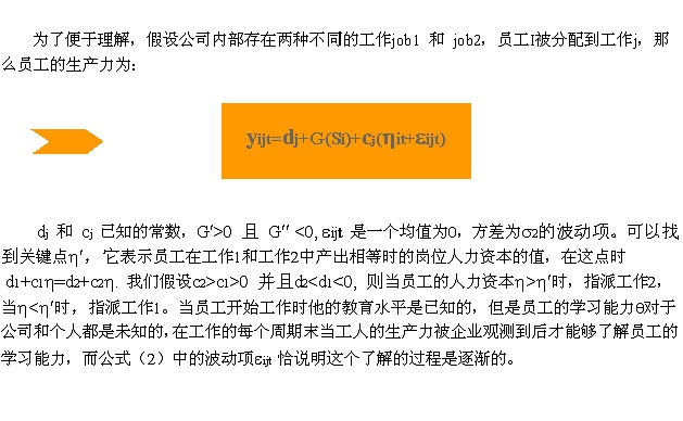 到此,我们找到了员工人力资本的函数表达式,接下来,需要寻找衡量人力资本高低的标准。 可以这样考虑,公司分配高人力资本的员工从事高层岗位,是为了使员工能够才尽其用,在岗位中创造出最大的生产力。所以,只要员工在某一级别的岗位中创造的生产力比上一级创造的生产力高,他就应该被分配到高级别的岗位。员工在某一级别岗位创造的预期生产力与上一级别岗位中创造的生产力相等时其人力资本值就是衡量分配因素关键点。