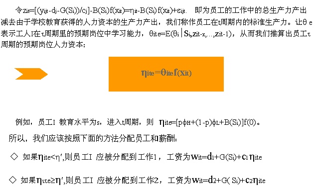 可是员工的人力资本h是员工上岗之前的预期人力资本,如何衡量预期人力资本,我们会在后面给出。下面先来考虑人力资本对薪酬水平的影响。 ◆ 人力资本对薪酬水平的影响: 分配员工到合适的岗位之后,就要考虑如何为员工制定其薪酬水平。每个工作周期的开始,公司总是以员工最大的预期生产力制定薪酬标准,并在此基础上参照外部水平调整。在这里,我们主要研究内部的影响因素。 很显然,我们需要找到关于员工最大预期生产力的函数表达式