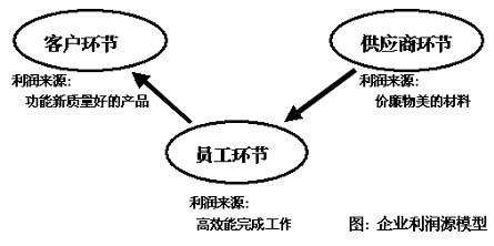 在中国开展知识管理的首要问题就是找到传播知识管理先进思想方法的切入点,让大家了解和认识到知识管理对企业管理的重要性。这里,我们将通过解析企业的核心利润源来认识知识管理。 “核心利润源”突然成了大家所关心的词,这要归功于《经理人》杂志零二年七月份期刊的宣传。实际上,提出企业核心利润源概念、并深入分析和探讨是从零一年九月份开始的。当时,由蓝凌管理咨询支持系统有限公司总顾问邓文彪博士首先在清华深圳研究院第一期知识管理讲座上公布了《企业核心利润源管理理论》,听讲的来宾有一百多人,主要都是企业的中高层领导,其中有TCL、三九集团、科龙等大型企业的信息主管,大家反应强烈,无一例外地都接受了这种以核心利润源管理导入的企业知识管理理念。 1、 办企业是为了什么? 这个问题站在不同的角度或位置来看都可能是不一样的。从社会上来看企业,企业是开展合法经济活动的实体组织。对企业投资者来讲,企业是赚钱的工具,他们办企业的主要目的就是为了赚钱,他们时刻关心的是:搞什么能赚钱?怎么搞才能赚到钱?怎么搞才能长期赚钱?,可以讲他们是为着企业要有利润源来 思考企业及企业管理的。对企业中的骨干管理者来讲,企业是他们实现个人价值、取得个人利益的舞台,一方面他们在为企业投资者着想,为企业争取利润,这时他们会想方设法把老板(投资者)的经营思想、经营目标分解为项目、事务和业务,并调集资源、协调关系去推动完成;另一方面,他们又在为自己及自己所属的部门谋取利益,不仅在经济上争取利益,还在个人的能力、前途培养上争取自己的利益。对企业中的基层管理者来讲,他们没有骨干员工那么大的抱负,他们把企业看成是自己取得个人现实收益、锻炼自己能力的场所,他们在领导给定的资源的条件下,一方面努力地为达到领导提出的目标而想方没法,这是在为企业争取利润;另一方面他们也要为自己经济利益着想。从企业的这三个管理层面,我们可以看到,管理都围绕着争取企业利润或个人的利益而展开。实际上,三层管理者都在不同的层面建立和强化利润源,即那些导致企业产生利润的来源。 每一个企业一般都会有多个利润源(利润源就是产生利润的因素,它们可能是材料、工具,也可能是方法、技能、理念等等),而各个利润源所产生的利润额是不同的。于是建立和强化利润源、创造条件使利润源最大化的产生利润,这是每一个企业、每一个企业老板工作的核心目标。既然利润源成了企业管理者关心的对象,那我们确有必要搞清楚利润源在企业的特点,甚至应该搞清楚利润源背后的基础或核心。 2、企业利润源模型 一个企业能利润概括来讲有三个来源环节:一是从客户来;二是从供应商来;三是从企业内部员工来。如下图所示:
