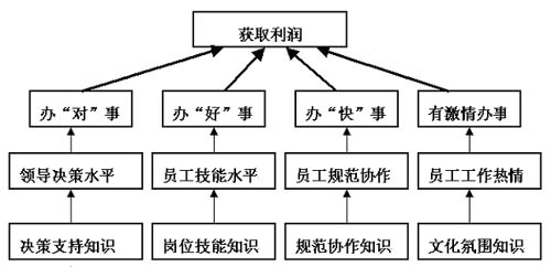 三个环节的链条是从供应产品到销售产品,利润体现在供应到销售的产品增值。每个环节的背后才是产生利润的来源。 客户环节背后的利润源:在客户那里能取得利润是因为我们能给客户提供功能新、质量好的产品。功能新意味着产品有知识含量,特别是新知识含量。举例来说,九五年生产VCD,那时一台VCD能卖到1800元,而每台VCD的利润几乎可以达到900元。这是为什么?因为当时只有那么几家VCD厂商掌握了VCD这种新技术知识,他们卖给客户的是这种新知识。现在一台VCD只卖到250元,且厂商的利润只有十几元,那是因为VCD的知识已经被众多厂家所掌握了,知识已经不新了,没有新知识含量。只有产品的创新,才能有高的利润,这实际是要在产品中加入新的知识含量。所以,在客户环节背后产生利润的利润源是产品的质量和知识含量。 供应商环节背后的利润源:显然,在供应商那里能取得利润是因为我们能取得价廉物美的材料。而价廉物美材料的取得是靠企业的采购部门员工有选择供应商的好办法和与供应商谈判的商务经验,这些办法和经验才是供应商环节背后产生利润的来源。 员工环节背后的利润源:从供应商到员工、再到客户,是产品从进料到加工、再成品的价值和利润实现过程,在这个过程中的每一项工作都是靠员工来完成的。显然,员工完成工作的效能是价值和利润实现的保证,能把工作做好的技能保证了产品的价值,能把工作做快的效率水平才保证了产品的利润。所以说,员工的效能才是员工环节背后产生利润的来源。 对以上这三个企业利润源,我们要问它们的背后又是什么?这才是企业管理者最终应该关心的。 3、利润源的背后是核心利润源 把企业三个利润环节背后的利润源进行以下分解: 客户环节: 知识含量=原有知识量+创新知识量 产品质量取决于:技术质量+服务质量 服务质量=服务设施+服务方法 供应商环节: 取决于:供应商选择方法+商务谈判经验 员工环节: 员工效能取决于:决策方法+实施方法+实施技能 显然,原有知识、创新知识都是知识;技术质量取决于技术知识;服务方法代表了企业对待客户的一种认识,它也是知识;供应商选择方法、商务谈判经验,这些也是知识;决策方法、实施方法、实施技能,这些还是知识。它们都是企业知识的不同表现。这一切说明:所有利润源背后支持的基本要素是企业知识。所以说,企业知识才是企业的核心利润源。 从以上分析,已经看到:企业就是在追求利润,企业管理就是要建立和强化企业的利润源。而核心利润源是企业知识,且掌握在企业员工手中,那么我们管理的核心问题转变成如何支持员工掌握好核心利润源,即掌握好企业知识。当然,这里的员工概念是广义的,即从企业的董事长、总经理到普通员工都是员工。 4、如何让员工掌握好核心利润源? 掌握好核心利润源,也就是在追求企业利润。对所有的员工来说 ,就是做好对企业争取利润最有利的每一项工作。把工作分一分,那么做好工作的概念实际是要把企业的事首先办“对”、然后要办“好”、还要办“快”。这个概念可以用下图来说明: 企业的事要办“对”,就是解决企业工作方向和目标的问题,这是首要问题。如果在这个问题上都有错误,那么企业工作做得再多都是白做。回顾一下,企业领导解决这个问题的过程,我们知道,要办“对”事靠的是领导的决策正确性,而这依赖于能否给领导提供充足的决策知识和决策信息。所以说要把企业的事办“对”,就要管理好企业的决策支持知识和信息,确保领导有决策水平,达到正确的决策。这包括了:企业的经营项目决策,经营产品选择,经营方式、方法的选择等。 方向和目标确定了,企业就要靠每一个岗位上的员工把事办“好”。这又靠的是员工要有把事办“好”的工作技能水平,而技能水平依赖于能否向员工提供充分的岗位技能知识,包括前人的工作成果知识、工作方法经验知识,还有旁人的工作成果和工作经验知识,以及支持工作的信息和基础知识等。所以说,要把这些知识管理起来,才能帮助员工把工作做好。 企业员工能把事办“对”,能把事办“好”,但没有效率也不行。一天的工作一天做完,就有利润;而几天做完,甚至更长时间才做完,就没有利润了。因此,还要把事办“快”,有效率才有效益。效率靠什么产生?在企业,首先是靠遵守规范制度,按照“绿”灯行驶,不要闯“红”灯,事情就会办得快一些;二是靠协作沟通,利用别人的智慧、别人的能力、别人的经验,不要做重复的工作,才会更有效率。这些规范制度其实是人们对工作行为的经验总结,是企业的知识。协作沟通的过程其实也是在交流和应用知识。所以说,规范协作实际上是把这些知识管理起来,支持员工把工作做“快”。 一个员工能把事办“对”、办“好”、办“快”,这只能说明他有能力。但他要是没有心情、没有热情、不想做事,那他再有能力也无济于事。因此,如何让员工有心情、有热情,也是非常重要的问题。观察一下,我们不难发现,员工有没有心情,有没有热情,关键在于:员工有成绩时, 能否得到大家的欣赏;员工有错误时,能否得到及时理解;员工有困难时,能否得到帮助;员工有疑惑时,能否得到解答;员工有意见时,能否有畅所欲言的场所。这其实是要求有一个员工大家互相鼓励、互相理解、互相关心、互相爱护、互相帮助的工作文化氛围,