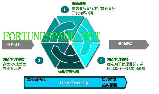 图2 西门子公司的知识管理参考模型 该模型聚焦于四个方面: 知识社区 试图跨组织边界达到“最佳实践网络”,使企业中各个领域的知识能够通过社区交流得到共享,使员工可以对业务的相关主题进行经验交流,充分利用已有的成功经验 知识集市 如果说知识社区建立了人和人、人和组织以及组织和组织之间的联系,而知识集市则提供了有关知识管理的基础设施,它通过提供知识地图、以及企业Intranet来进行最佳实践传输,保证所有员工能够访问最佳实践资源。 知识环境 知识环境主要是“软”环境方面对企业知识管理提供支持,即需要在企业战略及价值观等方面来推进知识管理在企业的实施,在组织中形成知识交流的气氛和知识共享的文化,使员工能够有效进行“从业务中学”、“分布学习”以及“虚拟团队学习”。 知识管理关键过程 建设知识社区、知识集市以及知识环境的最终目的就是为了有效实现对企业知识过程的管理,使企业知识共享、知识应用、知识创新的水平上一个新台阶。 在西门子公司的知识管理实践中,它还指出了一条通向成功知识管理的道路——以业务目标为导向,依据一定的知识战略,实施知识管理活动。它强调了一种融合思想,即应将企业业务目标、知识战略以及知识管理实施过程有机融合,知识管理实践应“从企业战略、业务目标中来,并到企业战略、业务目标中去”。其基本指导思想如图3所示。