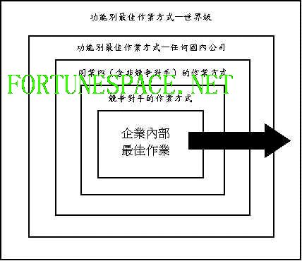 上面的图形可以说明标竿管理在选取学习对象时的思考架构。它表现出来的正是「跳脱框框之外思考」的态度。先从企业内部的自我检视开始,进而去了解竞争对手或是产业领导者的作法乃至于对不同产业领域中的佼佼者去关照学习,最后甚至寻求世界级的作业典范来整合最佳实务到自身的流程之中。如此攀越一座又一座的山峰以期超越颠峰达到登峰造极的境界。然而,对一般的企业而言,当然不必刻意直接去追寻最顶尖的目标。比较实际的作法是,只要任何比目前本身的还要好的作业方式就可以作为典范来学习,相信它们都可以提供企业具参考价值的信息。 一般来说,根据学习目标(goals)或标的(target)的不同,可以将标竿管理分为以下三种类型。 一、内部性标竿管理 (Internal Benchmarking) 大多数的多角化或是跨国性企业都会有数间分公司或是事业单位分布在不同的地点。因此可能会有许多性质相似的企业功能在不同的单位中运作。那这些组织便可以由进行内部作业方式的比较来开始他们的标竿管理活动。当然不可能认为经由企业内部检视就可以发现「最佳作业典范」。但这却比较容易作为一个起点,跨出进行改善的第一步。企业进行内部性标竿研究的目的在于发现组织内不同的单位之间涉及产品品质、获利能力或是满足顾客需求能力的不同点。另外,除了比较这些企业经营的关键成功因素外,也可以进一步去分析未来可能需要与外部企业进行比较的作业项目。因此,内部性标竿研究可以帮助企业去定义外部标竿管理的明确范围与主题。 内部性标竿管理是假设组织内某部门的工作流程比其它部门更具绩效,可以将这个部门的作法当作其它部门的规臬。至于这个最具绩效的部门可以由组织内部的绩效指针的衡量结果来寻求。 内部性标竿管理的最大优点在于所需的资料和信息易于取得,并且获得的信息不必经过费心的「翻译」便可以转换到本身的部门内,故不存在资料鸿沟(data gaps)的问题。此外也不需考虑涉及企业机密的麻烦。另外,在分化程度过高的企业内,内部标竿管理还可以促进事业单位或部门间的沟通。但是内部标竿管理的缺点则是视野狭隘,不易找到最佳作业典范。并且学习的对象局限在组织内部很难为组织带来创新性的突破。另外若是有内部倾轧的问题存在的话,易于造成偏见,无法虚心求教。 二、竞争性标竿管理(Competitive Benchmarking) 竞争性标竿管理主要在将直接竞争对手的产品、服务以及最重要的—工作流程与自己本身做比较。通常企业进行竞争标竿管理活动的主要目的在于专注焦点在彼此间的差距,所谓:「知己 彼,百战不殆」。尽管竞争对手的作业方式并不见得是行业内的最佳作业典范,但透过竞争性标竿管理活动所获得的信息却很宝贵,因为竞争对手的作业方式会直接影响你的目标市场。因此竞争标竿信息对于企业在进行策略分析及市场定位有很大的帮助。除此之外,竞争性标竿管理比起传统的竞争商情搜集更能让企业有系统的去分析竞争对手与产业环境。因此,在美国的企业界中,对直接竞争者进行标竿研究是最普遍的一种标竿管理方式。对许多将标竿管理当成是一种竞争策略工具的企业而言,任何与营运有关的重要项目只要是可以与竞争对手比较的都会去进行标竿研究。 除了信息极具竞争价值之外,竞争标竿管理的另一优点与内部标竿管理相同,那就是企业本身与竞争对手的作法在比较上会较为容易,并且一旦需要将对手的流程转换到自身企业时也不会有太大的困难。一般而言,作为学习对象的竞争对手即使采用的技术或作业方式与企业本身不尽相同,至少也极为类似。所以从对手那获得的信息可以很快的运用在本身的组织内。但竞争标竿管理的最大缺点则是相关信息搜集困难。尽管如此,仍然可以透过一些较好的信息收集方式来尝试着去做。很重要的一点是必须向对方强调这是一个找寻最佳作业典范的过程。对方或许正急切于改善本身的产品品质或服务方式来提升营运绩效。因此,对方或许会对「找寻最佳作业典范」这个议题或是你本身的作业方式感兴趣而愿意与你进行信息交换。藉由双方互惠的方式,比较容易达成信息搜集的目的。另外也可以透过第三者(the third party)来获取信息。例如以同业公会团体的名义成立信息交流协会来共蒙其利,如美国的「电信业标竿管理协会」就是一个竞争对手互相合作的例子。另外也可以用匿名的方式来委托管理顾问公司进行调查。 三、功能/通用性标竿管理(Functional/Generic Benchmarking) 除了专注在直接竞争对手的作法外,企业还可以将眼光拉离现存的产业中,去看看外部其它产业领导者的作业方式,分析它们之所以能获得领导地位的原因,找出它们成功的关键流程,并且尝试去整合这些最佳作业典范到自身的流程内。事实上,只专注在竞争者作业方式的排外性标竿研究反而会对组织本身追求最佳作业典范带来障碍。如果能够广泛的对于那些产业领导者或是在某些领域内表现杰出的企业进行学习,不论其处于何种产业中,那会对组织更大的助益。 所谓的功能性标竿管理就是如同上述的观念,寻求在某些领域表现杰出卓越的企业作为学习的模范,不论其处于何种产业。这些领域可以是所有的企业功能甚至任何的企业活动。换句话说,学习对象的选择完全以标竿企业在发挥企