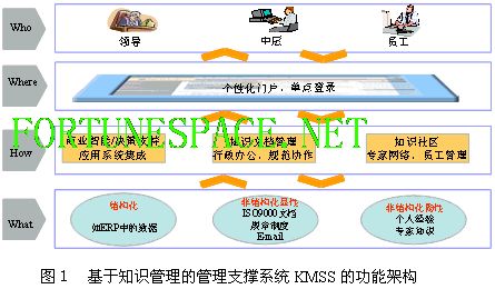 最近一段时间和企业人士交流知识管理,很欣慰地发现,已经有越来越多人谈知识管理不再局限在纯粹的IT话语中。这种情况对于知识管理在中国的深化应用是喜事,但对很多打着知识管理标记的IT解决方案提供者,却是心忧,忧虑的是在知识管理方面的话语权不再如以往那般轻松掌控了。 不过,这就是事物的发展规律,企业的经营范式就曾经历了从“制造-销售”到“感知-响应”的变迁。在知识管理上的这种微妙变化,或许也正是知识管理在国内由孕育逐渐走向成熟的一个脉动,但这个脉动并不见得是每个人都能听得见、体味到。 那么,对于想了解、想推进知识管理的企业,对于想进入、想提升知识管理服务的解决方案者应该如何面对这种变化呢?我觉得还是一句话——知识管理必须要真正实现管理和IT走到一起来。这句话本身并不新鲜,前几年已经有了很多这方面的理念探讨,也有很多研究者各自从管理的角度、从信息技术的角度、从组织行为学的角度来对知识管理进行分析。但是,客观来说,目前国内知识管理实践领域能够在知识管理解决方案中真正落实“管理”和“IT”结合的少之又少,有的时候,并不是不想,而是不能。 知识管理:IT的视角 企业信息化建设历程也正如一个人的成长历程,不同阶段总会有不同的成长烦恼。最早,大家烦恼的是如何实现PC互连,以打破硬件和硬件的壁垒;到后来,大家烦恼更多的是如何深入应用(ERP、CRM),来打破部门和部门的壁垒。而现在,大家发现,企业里面各种应用系统已经很多了,但却又面临着“软件泛滥”的烦恼:应用系统操作界面各不一样,每天先到SAP中查询销售报表,再到OA中审批费用,再到HR中查看本月人员流动情况,再到……。那么,能不能打破软件和软件的壁垒,并对应用系统实现整合和提升呢?这是目前企业IT应用发展中的又一道门槛,可以称之为管理支撑门户(Management Supported Portal,MSP)。 事实上,单单看门户这个词,目前也是很热,FT2001年6月对门户的评论是“门户被列为下一件大事情……出乎意料地振奋了萎靡的IT市场”,而Dataquest分析认为“2002年门户软件以60%的速度增长,预计到2006年将以更迅猛的速度增长”。但热中还需要冷思考,在美国,即使很多企业已经应用了门户,但仍有72%的管理者认为知识没有在他们的组织得到重复利用,88%的人认为他们没有接触到企业最佳实践的机会。而且,对大多数企业来说,ERP等业务系统所管理的结构化数据只占到企业全部信息与知识的10%左右,其他的90%都是数据库、数据仓库难以存取到的非结构化信息和知识,如文档、Email、个人隐性知识等。透过这些现象和分析,可以发现——MSP不能仅仅是单独的一扇门,门内还需要有丰富的内容,这就是知识管理(Knowledge Management,KM)。 管理支撑门户(MSP)和知识管理(KM)。而这两者原本就是孪生兄弟,它们只有整合在一起,才能够真正实现“管理形式”和“管理内容”的统一,也可以用个公式:MSP+KM=KMSS(KM based Management Supported System),即基于知识管理的管理支撑系统。 那么,KMSS到底有何功能呢?可以用一张图来表示,其核心在于通过一个集成的系统实现人(Who)、访问入口(Where)、功能(How)、知识(What)的统一(图1):
