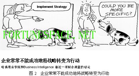 Who:领导、中层、员工、外部人员; Where:个性化知识门户,并以单点登录方式; How:调用相关功能,如知识文档管理、规范协作管理、行政办公管理、知识社区、应用系统集成、商业智能等; What:获取、挖掘和利用所需的三类主要信息和知识,即业务应用系统如ERP里的结构化数据、文档类的非结构化显性知识和经验类的非结构化隐性知识。只有这样,才能在实现对业务支撑系统提升的同时,奠定了企业真正“管理”信息化的基础。 知识管理:管理的视角 看过一幅漫画(图2),是哈佛商业学院和Business Intelligence最近所做的一项联合调查的结论:企业常常不能成功地将战略转变为行动。