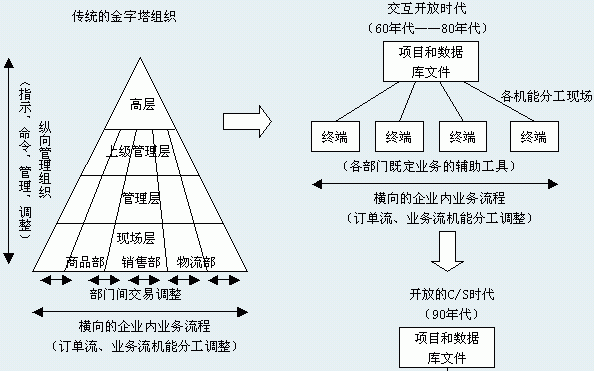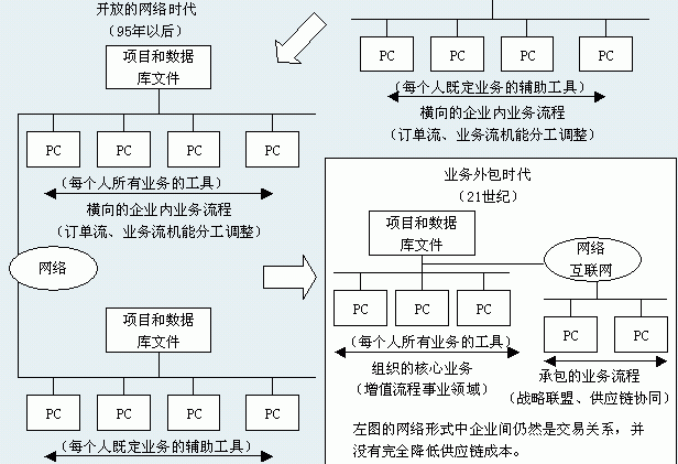 网络的形成是企业将业务流程的管理从完全的企业内部转向企业间的起始阶段,在此之前,企业业务的管理往往是分散的,采购、生产、库存、配送、营销等职能相互割裂,而且所有的管理重点也都是局限于企业内部。到了网络阶段,则出现了重大的变化,这种变化反映在一方面各业务活动开始作为一个整体得到了关注和管理,人们意识到只有综合、协调地对各种业务进行控制,才能取得最大的经营绩效;另一方面业务管理的视角已经开始从单纯的企业内部向企业外部转移,这表现在企业的各职能管理者开始与他企业同职能管理者不断进行沟通和协调,以最大程度提高职能管理的绩效。