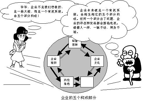 企业是一个有机体,不是由工厂、销售部、办公室、财务部等单位、部门的简单加总。企业要有效率,必须是构建成一个完整的有机系统。对它的构成分析不能肢解,就像不能把人肢解成头、身躯、四肢一样。人不是由这几大件简单组合而成的,缺少一两件,比如没有手臂或者腿脚,他仍然是一个人。企业作为一个有机系统,也是如此,不能肢解成几个孤立的单位、部门。按照系统的思路进行分析,企业只能是由彼此联系、彼此协调、相互依存、相互制衡的五个部分——经营目标、企业组织、岗位角色、业务流程、企业文化,加上由企业所有者、经营者、管理者、劳动者四者之间的关系构成的内部环境构,和由国家政府、社会公民、产品客户和合作伙伴四个方面构成的外部环境,共同构成的一个开放系统。在这个系统中,由企业所有者、经营者、管理者、劳动者四者之间关系的性质,决定着企业五个构成部分的性质,企业构成的五个部分又通过自身的展示作用,在获得社会外部环境认同之后,从外部获取发展资源,包括市场资源,来实现其发展。 企业的五个构成部分 经营目标、企业组织、岗位角色、业务流程、企业文化,五个部分作为一个整体,构成一个完整的企业。它们相对独立,但又相生又相克,不可分割。 ![]() 如果从相反的关系来看,企业构成的五个部分,又构成一种相克的反作用关系。企业文化一经形成,它就会影响到企业内部的做事方式,从而对企业的业务流程构成一种反作用关系;业务流程本来是企业内部人们做事的方式和方法,但它一经稳定,又对做事的人——岗位角色提出要求,从而反作用于岗位角色;岗位角色个人的特点,又在一定程度上反作用于企业的组织,由人来改造组织;企业组织又制约着企业经营目标的形成,企业经营目标的确立要从现实出发;企业经营目标形成后,又会倒过来对企业文化的价值观念形成一定的影响,企业经营目标中包含有价值观念,它一旦确立就需要保持相对的稳定,从而限定对企业文化的选择和调整。 摘编于舒化鲁《拥抱辉煌的六根魔杖——企业规范化管理实施方案》第204—206页,北京,中国人民大学出版社2003年2月第一版 |