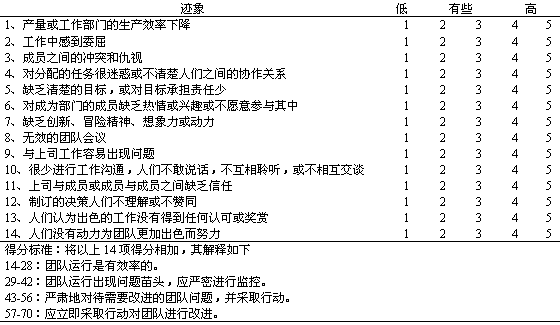 案例描述 小王、小张和老李围正绕在刚生产出来的空调周围查找原因,为什么空调指示灯显示运转正常而空调却没有制冷?这种空调是公司新开发的环保节能型空调,小王是生产线上的总装工人,小张是负责生产过程排产和工艺的生产工程师,老李是产品开发工程师,虽然三人在公司的角色和岗位职责非常不一样,但是,自这种环保节能型空调投入试产一来,他们三人就在一起工作了。在面对问题时,三人并不气馁,他们对每一个环节进行仔细分析,查找问题原因,不但解决了这个问题,而且顺利地完成了公司新产品的试生产任务。 在这次团队协作配合中,清楚地意识到如不是因为这次新产品的试生产任务,他们三人是很难在一起进行工作的,小王、小张和老李充分认识到各自的工作特点和能力长短,要达成团队工作目标,必须要打破传统部门分工的限制,紧密地围绕这次新产品试生产任务开展工作,使这个小小的团队高效地运转,最终完成团队的工作目标。 高效团队的好处 从这个案例我们可以知道,小王、小张和老李能够顺利完成团队任务,这表明其团队运作是有效的。高效团队表现在:团队整体运作所取得的工作成效通常大于单个人员取得的工作成效;团队可以有效地解决复杂的问题;团队工作可以激发人员的创造力;在团队中成员之间可以互相学习、互相弥补各自的不足;团队工作可以加强人员的自省,令团队成员充满工作激情。 高效团队的特点 那么,高效团队有什么特点呢?有专家对高效团队研究发现,高效团队具有以下特点:1、规模比较小,一般不超过10人;2、互补的技能,即团队各成员至少具备科技专长、分析解决问题能力、沟通技能;3、共同的目的,共同的目的产生的前提,并可以为成员提供指导和动力;4、可行的目标以使成员采取行动和充满活力;5、共同手段或方法来达成目标实现;6、相互之间的责任。 设计高效团队 在企业团队建设实际运行过程中虽不是一件轻松的事情,但也不象大多数人认为那样——是一件非常困难的事情,常常感觉好象无从下手。通常我们可以借助一些常见的管理工具来简化团队建设工作。这里介绍一种大家都非常熟悉的5H1H方法来建设高效团队。 高效团队建设中的5W1H是:who(我们是谁)、where(我们在哪里)、what(我们成为什么)、when(我们什么时候行动)、how(我们怎样行动)、why(我们为什么)。通过明确这几个方面的问题来建立高效团队。 我们是谁(who)?即团队成员自我的深入认识,明确团队成员具有的优势和劣势、对工作的喜好、处理问题的解决方式、基本价值观差异等;通过这些分析,最后获得在团队成员之间形成共同的信念和一致的对团队目的的看法,以建立起团队运行的游戏规则。 我们在哪里(where)?每一个团队都有其优势和弱点,而团队要取得任务成功又面对外部的威胁与机会,通过分析团队所处环境来评估团队的综合能力,找出团队目前的综合能力对要达到的团队目的之间的差距,以明确团队如何发挥优势、回避威胁、提高迎接挑战的能力。 我们成为什么(what)?以团队的任务为导向,使每个团队成员明确团队的目标、行动计划,为了能够激发团队成员的激情,应树立阶段性里程碑,使团队对任务目标看得见、摸得着,创造出令成员兴奋的幻想。 我们什么时候采取行动(when)?合适的时机采取合适的行动是团队成功的关键,团队任务的启动;团队遇到困难或障碍时,团队应把握时机来进行分析与解决;以及团队面对内、外部冲突时应在什么时机进行舒缓或消除;以及在何时与何地取得相应的资源支持等;都必须因势利导。 我们怎样行动(how)?怎样行动涉及到团队运行问题。即团队内部如何进行分工、不同的团队角色应承担的职责、履行的权力、协调与沟通等,因此,团队内部各个成员之间也应有明确的岗位职责描述和说明,以建立团队成员的工作标准。 我们为什么(why)?对于这个问题,目前在很多企业团队建设中都容易被忽视,这可能也是导致团队运行效率低下的原因之一。团队要高效运作,必须要让团队成员清楚地知道他们为什么要加入这个团队,这个团队运行成功与失败对他们带来的正面和负面影响是什么?以增强团队成员的责任感和使命感。即将我们常常讲的激励机制引入团队建设,可以是团队荣誉、薪酬或福利的增加、以及职位的晋升等。 团队运行中的测试 在团队运行过程中应对团队进行面谈或问卷等必要的测试,以明确已经或可能产生的问题,对团队运行存在的问题进行分析,并向成员汇报,以确定共同的和重要的问题、主题和提出解决方案。对于任何阻碍团队有效行事的事情都可以列为解决的对象。我们可以通过以下团队建设效率测试表进行问卷调查。