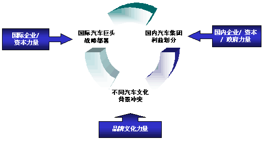 近年来纷纷杀入汽车产业的“外行”并不鲜见。继6年前春兰开启造车先河之后,家电企业“集体越界”在去年掀起了一个高潮,美的、新飞、格林柯尔等纷纷情牵汽车产业,白酒巨头五粮液甚至也有意“酒后驾车”,而“手机中的战斗机”波导已经把“战火”烧向轿车,预计新车3月底即将上市。 二、繁荣背后的冷思考 1、国际企业/资本力量推波助澜,单一民族企业举步维艰 基于对中国市场良好的预期,以大众、通用、戴姆勒-克莱斯勒、福特、丰田、雷诺-日产、标致-雪铁龙、本田、宝马为代表的国际九大汽车巨头已经纷纷登陆中国,开展了广泛的合资合作。德国大众更是先入为主,挟上汽大众、一汽大众两大主力,占领了中国轿车市场的大半江山;通用出手阔绰,志在必得;本田在广州、武汉设立生产基地;戴姆勒-克莱斯勒加大与北汽、东南汽车合作;丰田通过与一汽的联盟,形成了成都、天津、沈阳三大阵营,并即将在广州建立生产基地;宝马与华晨合作,瞄准高端市场;福特与长安合作,主推家庭轿车;日产牵手东风,积极扩大产能;PSA也借东风卷土重来;至此,国际九大汽车巨头及其子公司已初步完成了中国战略部署。 可以肯定的是,鉴于中国轿车产业的广阔前景,各大汽车集团在中国的战略投资和部署只会加深加强,而不会削弱,这一方面将极大的推动中国轿车工业的飞速进步,使得国内市场国际化,产品、技术世界同步化,另一方面,也将使得中国的轿车市场竞争更加错综复杂,竞争将在更深、更广的规模、资本、技术实力、品牌层面展开。起步相对较晚,力量相对弱小的民族汽车企业在这滚滚硝烟中将举步维艰。 2、呼唤印证民族DNA的汽车品牌文化 不同的地域、民族和不同的文化背景孕育了不同的汽车文化,反之,每一种汽车文化又都印证着民族的DNA,渗透着一个民族的气质、历史和性格。以美国为代表的美洲汽车文化的豪华、舒适、大气,以德国为代表的欧洲汽车文化的精细,严谨,庄重,以及以日本为代表的亚洲汽车文化的精致、灵巧、经济,即是当今世界的三大主流汽车文化。 随着国际品牌的不断泛化和本土化,以我为主,洋为中用将是我国汽车工业发展的主旋律,而中华民族特有的东方儒家的雍容、大度、沉稳;道家的低调、超脱;法家的入世、务实、进取与激情,必将加速具有国际品牌和国际视野,又反映中华民族气质和文化积淀的民族汽车品牌的诞生。