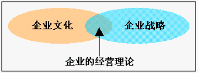 企业文化与企业战略看似两个泾渭分明的概念,但其间却有着十分密切的联系。哈佛商学院曾经就企业文化和企业战略方面的问题调查多名企业界人士,但同一个问题在一部分人士看来是属于企业文化范畴,在另一部分人士看来却是属于企业战略范畴,由此分析得出,两者之间并没有明确的界限,并且存在着一个交叉,这个交叉既属于企业文化,又属于企业战略。 这个交叉就是企业的经营理论,它同时也是企业文化和企业战略的起点(如图1):