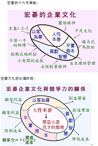 在规模小的时候塑造文化 企业文化是一种价值观,是一个无形的基础架构。一般我们在谈“基础建设”的时候,好像更多的是指交通、海港的建设和规划,只有先有了这些基础的建设,才能有城市的发展。 对企业而言,企业文化实际上就是这样一个无形的“基础架构”,它不仅能够协助企业建立深厚的文化基础,而且还能有效地帮助企业走向成功。 要塑造一个企业文化,最好是在组织还很小的时候就开始,因为规模大了就不太容易培育及推动了。记得宏碁创业的时候,全公司只有一、二十个人,大家每天都关在同一个地方办公,我就天天给他们洗脑,灌输理念,经常举证一些日常工作上的小故事,希望塑造出一个深植人心的企业文化。 企业文化在塑造过程中,最主要的角色就是领导者,但社会上还是有很多公司是没有文化的,这是因为领导者自己不重视、不在乎。我相信这些公司如果想长期经营,是会碰到瓶颈的。 不断修正的宏碁文化 有的企业是随波逐流的企业文化,因为它没有形成自己特有的文化,非常容易受外界影响,这其实就等于没有企业文化。 比如说,宏碁在美国有独立的公司,但是我们美国的同仁,就没有企业文化。因为他们的文化,每天都受到外界的影响:他们的想法、价值观,就是美国一般企业的价值观。 当他们用那个价值观来开拓宏碁的业务的时候,宏碁的特色、宏碁的优势,恐怕就变成了宏碁的弱点了。所以,没有文化就成为弱势,强势文化一入侵,很容易就迷失了。 我们一直在修正我们的观念,我们提出过的“穷小子文化”,后来演变成“平民文化”(就是要养成平实务本的工作态度);我们刚开始强调的“长期马拉松”精神,后来改成了“接力式马拉松”,因为一个人跑马拉松是很累的,如果有很多人来跑,就可以相互支持了。 等于我们是先有了这些外围的理念,才慢慢形成比较具体的宏碁文化的。1985年左右,我们把这些理念凑在一起,组合成了一个十六字真言:人性本善、平实务本、贡献智能、以客为尊(如下图所示)。也就是说,这个理念不是某一天突发奇想而来的,而是大家在创业过程中不断沟通所形成的共识。