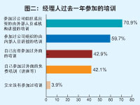 培训经历 要点:在过去一年中, ●超过九成半的经理人参加过各种各样的培训 ●近八成半的经理人接受过公司提供或资助的培训 ●近六成经理人自行参加外部培训 ●近一成半经理人为参加过多次和多种培训的"受训狂" ●约一半经理人在培训上的花费在5,000元人民币以上 ●平均每个经理人花在培训上的费用为13,101元人民币 在过去一年中,完全没有参加过培训的经理人只占3.9%,表明中国经理人在积极地接受培训。有59.7%参加过公司组织的由内部人员讲授的培训;有70.9%参加过公司组织或出资的由外部人员或机构讲授的培训;有42.1%自己出资参加过外面的培训;有42.9%自己参加过外面的免费培训(讲座等)(见图二)。