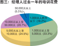 在过去一年中,公司完全没有提供培训机会的经理人仅占14.9%,表明中国企业在积极地为经理人提供培训机会。完全没有参加过外部培训的经理人占39.2%,说明专业培训机构仍然有很大市场空间。有45.5%的经理人同时享有由公司提供和组织的内部培训和外部培训。有23.5%的经理人既自行参加过外面的免费培训,又自己出资参加过外面的收费培训。在过去一年中,四种类型的培训都参加过的"培训狂"经理人有181人,占14.5%。 在过去一年中,经理人身上花费的总的培训费用(包括自己和公司的总的投入,包括差旅费用等)在1,000元人民币以下的占16.2%;在1,000元以上至5,000元的占33.3%;在5,000元以上至10,000元的占24.5%;在10,000元以上至50,000元的占20.7%;在50,000元以上的占5.3%(见图三)。