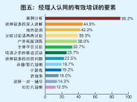 对于列出的19类培训需求,经理人的选择由高到低如下(见图四):1、领导力(62.4%),2、沟通/讲演/谈判(48.5%),3、企业战略(45.6%),4、外语(43.3%),5、财务管理(42.9%),6、时间管理/效率管理(42.1%),7、战略规划(38.8%),8、人力资源管理(38.3%),9、项目管理(36.0%),10、团队合作(30.6%),11、销售技巧(29.1%),12、产业及行业趋势(29.0%),13、职业发展(28.5%),14、国际营销/出口管理(23.5%),15、本公司文化(15.2%),16、质量管理(14.8%),17、电子商务(13.1%),18、本公司产品及服务(10.0%),19、电脑/信息技术(9.8%)。 其中,经理人对于"领导力"的培训需求最为突出,排在第二位的"沟通/讲演/谈判"同样是"软性"技能。"外语"排在第四位的位置,反映了商业环境越来越国际化的趋势。 有效培训要素 要点: ● "案例分析"是最被认同的使培训有效的要素,被超过九成的经理人认同 ● "讲师较多的深入讲解"和"角色扮演"排在第二和第三位的要素,受到超过四成的经理人认同