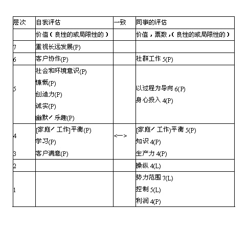 同事对优点的评估:1、明确、智慧和知识;2、愿景。 同事对缺点的评估:1、缺乏与同事的沟通;2、缺乏团队建设技能。 同事的建设:多倾听同事的需求,多与同事沟通,减少与老板的沟通,减少个人野心。 领导能力评估案例分析 以下三个案例分析说明了领导评估工具的使用。特里、帕特和杰克是一支10人管理团队的成员。团队的每个成员都为他们提供了反馈。自我评估的结果列在左侧一栏,9名同事的反馈结果列在右侧一栏。每个价值,根据其是否支持或阻碍有凝聚力的企业文化的建设,而被分为良性的(P)或带有局限性的(L)价值。认为此人具有某种价值和行为的同事的数量列在右侧一栏中。表中只显示了位于前10位的价值和行为。中间一栏显示的是个人自我评估与同事对自己的评估相一致的地方。 在特里对自己的管理价值和行为的评估与他的同事的评估中有5项是一致的,表明特里对自己的认识与同事的看法相似。这通常是真实和自知的表现。特里和他的同事都认为他的意识分布是平衡的。他还表现出较强的客户协作技能(第六层次),关注愿景和伦理道德(第七层次)。特里最需要努力提高的领导素质是团队协作 (第四层次)和团体精神(第五层次)。他的同事希望他更多地进行沟通并倾听他们的需求,希望他更多地参与集体的行动,而不是过度关注个人的“出类拔萃”。特里潜意识地知道他不善于自己内在的修养,因为他在自我评估中没有列出任何第五层次的价值。同时,他还坦率地承认他喜欢竞争,希望出类拔萃,并且极度忠诚。他的忠诚是对老板的忠诚,而不是对团队的忠诚。 特里的CTS指数是54—19—27,这一指数量度的是较高的三个意识层次(公共利益)、中间层次(变革)和较低的三个意识层次(个人利益)的价值分别所占的比例。特里的CTS指数显示:他的各个方面都不错。如果加强对变革层次的关注,这一指数还可得到改善。图表还显示,他具有第六和第七层次的领导素质(伦理道德、愿景、正义、客户协作和战略联盟)以及第五和第四层次的个人素质 (诚实、正直、创新和平衡),但他缺少第五和第四层次的团体和团队建设的价值。 特里的同事对他的PTOS(P)指数的评估是4—O—4—1,这一指数量度的是前10今价值中,个人、团队、企业和社会价值的数量。他们认为他具有 4个个人价值、4个企业价值和1个社会价值。他们还认为他具有一个带有局限性的团队价值——出类拔萃。特里对自己评估的PTOS(P)指数是1—1—3—2,PTOS(L)指数是0—3—0—0。他为自己确定的4个团队价值中,有3个带有局限性。