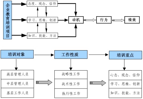 三、年度培训课程体系设计与课程评选 1、年度培训课程体系设计 在制定企业年度培训规划的基础上,必须设计出相应的企业培训课程体系。以下是企业培训开发的“动机行为模型”和针对客户企业中不同对象和不同岗位的课程开发模型。