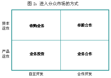 2.企业生存法则 一个企业要想长期生存下去,必须把握好一个基本法则:“唯一”和“第一”的辩证关系。也就是说,你最好做到市场上的“唯一”,如果做不到就要努力做“第一”,否则就难以赚取合理而持续的利润。然而,中国很多企业恰恰把这个顺序倒过来了,即先争取“第一”,不行再考虑“唯一”。但不管先做“第一”也好,先做“唯一”也罢,最后的结果是必须做分众市场。原因很简单: 假如你的目标是大众市场的第一,你的产品必须做到同等质量价格最低,这就要求把成本降到最低,但问题是你有没有获取最低成本的能力。就算有了,还有一个问题:别人是否也有这个能力?你的对手一旦拥有跟你一样的能力,那接下来就要打资源消耗战。但不能忘记我们的股东,他们不会轻易答应你这样做。这时,你就得考虑如何保持合理利润,这就迫使你去思考“唯一”。那么,你只要决定做“唯一”,就得把大众市场划分成若干个小市场,从中找成就“唯一”的途径。 有人可能会问:我不做“第一”,也不做“唯一”,但照样能活得好好的呀?在中国,这种企业比比皆是。但我们必须知道他们的生存方式是什么,那就是在市场缝隙中生存。这种企业一没有规模优势,二没有差异化优势,所以一旦有风吹草动就死得快。当然,也有部分企业勉强活下来了,怎么做到的?做分众市场,把有限的力量全部集中到一个能够控制的范围内,做所谓的“地头蛇”。 如何发现分众市场 1.隐性需求是分众市场的前身 说起分众市场,很多人往往陷入一种困境:顾客需求总是琢磨不透且没完没了,不知何时能够全面满足。为什么消费者需求让人感觉琢磨不透呢?主要原因是:在产品管理中没有找到需求的规律性,没有能力把它进行分类,从中找出有价值的需求。所以,那些市场总是忽隐忽现。如果你能找到一定的规律性,就会发现需求的隐性及其价值。真正的差异化来自顾客相对隐性的需求。 比如,四个轮子、好的发动机、不错的外观和一定的安全性,这是对汽车显而易见的需求,对于汽车制造商来说这可能是最低的标准,但是就算满足了这些需求,销售也不一定好到哪儿去,因为最容易满足的需求也最容易招来对手。而有些顾客的需求就比较隐性了,比如方向盘可自由调整、人性化电动座椅、自动排烟系统、倒车提示、后视镜不反光等等,这些需求有时不容易发现,但对你的产品却更有价值。 因此,需求越隐性越有价值,顾客的隐性需求就是分众市场的前身。企业要发现分众市场,必须从顾客相对隐性的需求入手,开展深入细致的市场研究工作。 2.“对号入座”和“愿者上钩”要并驾齐驱 在分众市场的研究中,不要把分众市场看成对现有需求的划分。在实际操作中,“对号入座”和“愿者上钩”应该并驾齐驱。 “对号入座”就是把现有的需求进一步划分,更有针对性地满足目标顾客需求。“愿者上钩”就不一样了,细分后的市场可能在实际上还不存在,也就是说顾客自己都不知道需要什么,这时就要引导他们的需求,让他们逐步“上钩”。比如,顾客原来根本没有想过会有无氟冰箱,但这种产品一旦出现,很多人却愿意支付更多的钱。 企业往往陷入“对号入座”的陷阱中,停留在显而易见的需求上,忽略了“愿者上钩”的重要性。尤其很多中小企业,认为跟在老大、老二的后面更加安全,其实这是一种“无奈的错误”。无奈是因为大部分中小企业技术、设备确实不如老大、老二先进;错误是因为老大、老二在“对号入座”的背后都有明显的成本优势,你有吗? 3.精细地舍弃,谨慎地集中 分众市场细分到什么程度才是合适的?做过战略管理的人可能都有这种感觉:面对那些庞大的数据库往往一筹莫展,觉得无法驾驭这个庞杂的“助手”,甚至有时走向数据分析的极端,最后觉得什么都是机会,什么都难以舍弃。 其实,我们使用数据库的真正目的,就是精准地看到要放弃哪些市场。学会放弃才会更加精细地服务于你的目标市场,否则虽然有这个能力,但是资源分散、能力分散,造成运营成本上升,最后在目标市场上赚不到钱。 所以,要找到市场细分的合适境界,必须引进“边际效益最大化”的理念,详细算好一笔账:怎么做才能赢得合理而持续的利润。算清楚了,就要敢于对部分市场说“不”。 4.细分市场要与资源匹配 在实际操作中,市场细分的变量和方向我们都可以灵活掌握,但细分出来的市场需求我们有没有能力满足,必须认真思考,这是界定分众市场的重要依据。 在分众市场和企业资源的匹配性方面,需要考虑的因素很多,诸如生产能力、技术水平、营销能力、人员资源、组织保障等等,但由于分众市场的不同特征,能力的权重是不同的,必须合理把握不同能力间的权重,重点突出核心能力。如果核心能力不足,就不要硬着头皮去做,否则企业要么不赚钱,要么违规经营,长远看得不偿失。 分众市场怎么做 1.正确选择进入方式 对于进入分众市场的方式,我们必须从战略的高度看问题,为企业最大限度地节约时间和金钱上的成本。 选择分众市场的进入方式,至少要回答好两个问题:一是自主开发还是与别人合作开发?二是采用产品运作手段还是资本运作手段?正确回答这两个问题,我们便可以知道具体的进入方式(如图2)。