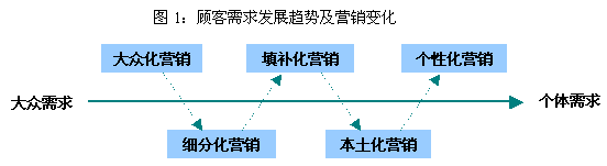 中国很多行业面临同一个问题——同质化,尤其在新兴行业和市场潜力大的行业,此问题更加突出,导致的后果就是大家都在打价格战,在同一个市场上死拼。出路在哪里?分众市场! 为什么要做分众市场 企业应不应当做分众市场的理由只有一个:能否保持合理而持续的盈利能力。如果做大众市场仍然能够持续盈利,就没有必要做分众市场;如果做大众市场无法保持盈利,甚至发生亏损,就得慎重考虑了。我们从顾客需求规律和企业生存法则两个角度分析: 1.需求演变规律 做营销,非常关键的一点是如何把握好趋势。就顾客需求而言,随着物质生活水平日益提高,总有一群人对目前的产品和服务不满意,提出更高或更个性化的要求,比如奶粉要给婴儿买益脑配方的,给儿童买补钙配方的,给老人买无糖配方的,给自己买脱脂配方的,等等。正因为顾客需求有了这种分散化和个性化的趋势,营销也随之发生变化,从原来的大众化营销逐步向个性化营销发展(见图1)。因此,分众市场的出现和细分化营销是大势所趋。