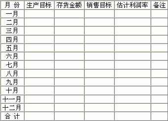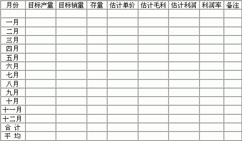一、经营目标 分析及说明: 二、产品别产销目标(视产品类别加页填写) 分析及说明: 三、原物料采购预算 四、人事计划 (一)编制 (二)工资 五、费用预算 制造费用 每月 全年 销管费用 每月 全年 间接工资 工 资 间接材料 佣 工 动力费 文具印刷 水电费 邮电费 折 旧 租 金 交际费 旅 费 保险费 广告费 邮电费 保险费 修缮费 其他费用 杂 费 合 计 合 计 六、投资计划及改善专案 项目 金额 说明 七、本年度管理方针及措施 (一)生产方面 (二)业务方面 (三)人事总务方面 (四)其他