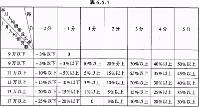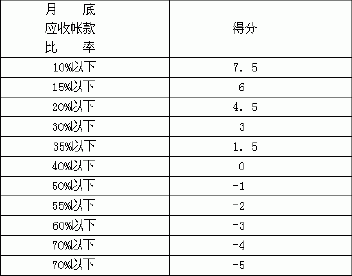 1000元以下者零分;1000元以上、2000元以下得1分;超过2000以上每增加达1000元者,则加得分1分;反之,每上平均贡献额若为负数,则每负1000元扣其得分1分。 (五)月底应收帐款比率: 1.凡未依照会计办法规定作业而越区交货,经裁定拨补实绩时,则其帐款仍留原开发票单位,并由其负责收款:如系依照会办法规定作业而代开发票者,则该笔交易的帐款得随实绩拨补。 2.营业人员向客户收取票据缴付货款后,遭致退票所形成有“问题票据”,在未另作处理之前,一律视为未收的应收帐款。 3.应收帐款比率的计算,一律四舍五入,不计小数点。 4.应收帐款比率的计算公式如绩效评核表上所示,其得分规定如表6.5.8: 表6.5.8 (六)本月倒帐总额的扣分规定: 单位内发生的倒帐,经提报核准赔偿的当月份,其该笔交易的金额在当月份总营业额的0.25%以下者不扣分;超过0.25%以上未达0.5%者,则扣得分总分一分;超过0.5%以上每增加达0.25%者,则加扣得分总分一分。唯上述倒帐金额如经悉数索回时,则于索加当月份追回原所扣分数。 (七)平均服务收入成长率: 1.分公司的平均服务收入成长率得列为评分项目,惟各单位第一次平均服务收入成长率计算,应以其前6个月的平均服务收入为基数,并就其超过此基数部分除以此基数计算。 2.新成立单位如成立时间未达6个月者,其基数由服务部提供资料转呈执行副总经理核定。 3.凡上月份平均服务收入未达第1次计算的基数者,而本月份已超过该基数时,则其成长率一律依其超过基数部分除以基数计算的,其得分如表6.5.9: 表6.5.9