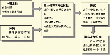 建立管理者联合团队的原因之一是组织目标一般是比较模糊的,各部门的经营目标相互之间常常不一致。当目标模糊、不协调时,管理者在问题优先性上也不一致。他们必须在不同问题上讨价还价,就解决哪个问题等内容建立联合团队。原因之二是个人管理者倾向于采用理性方法但受个人认识的局限性和其他因素影响,管理者没有足够的时间、资源和精力去识别问题的所有方面及处理与决策相关的所有信息。这些局限性导致了建立管理者联合团队的行为。管理者之间进行相互沟通、交换观点以收集信息和减少认识的模糊性。建立管理者联合团队将导致决策获得利益集团的支持。