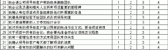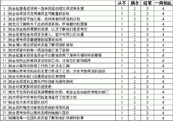 总分: 96~128恭喜!你已是一位杰出的项目经理人才。65~95您有基本的项目管理技巧,但仍需要改进一些弱点 32~64您尚欠缺基本的项目管理技巧,建议你多多学习! 建议: 课前先做自我评估 课后每月再作自我进步了解 对于屡次皆低分的项目,思考问题的根源与解决之道